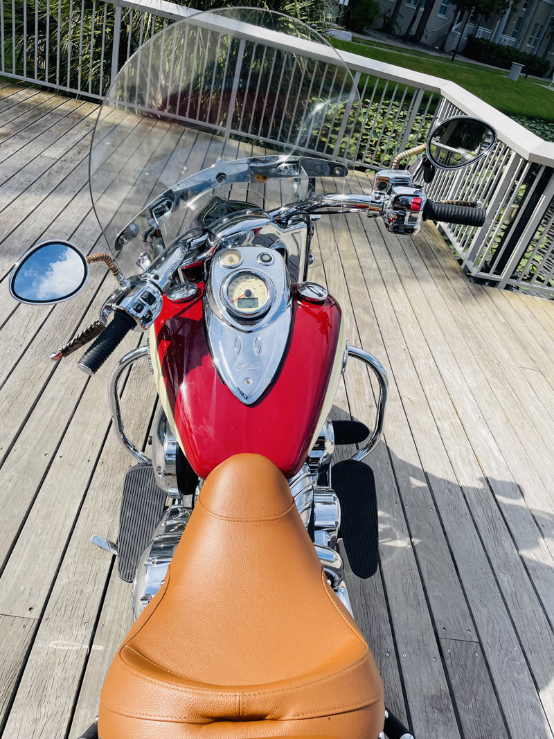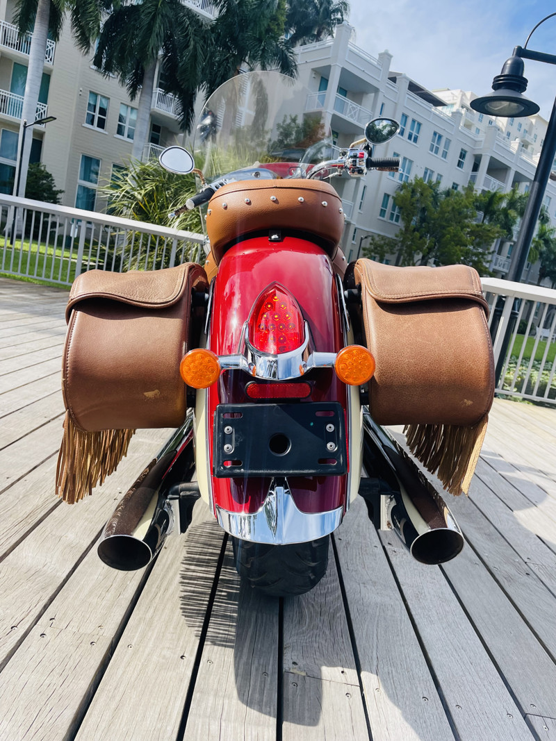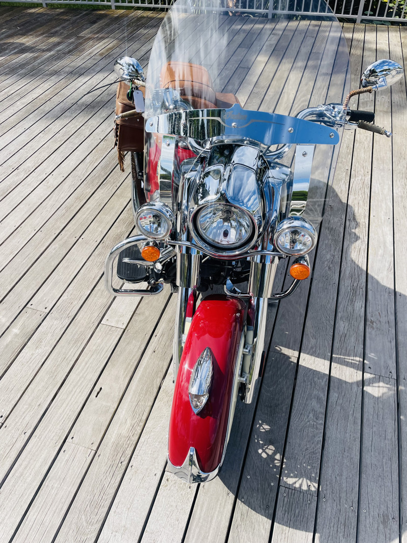 This bike has suffered the indignity of having been stored under cover outside for several years and has some signs of corrosion on various parts and chrome bubbling. The seat (as you can see) has been replaced, the bags are still original since they were off the bike for most of their life. The bike is still one of the prettiest bikes ever produced. The perfect balance of modern machine with an amazing motor and the old classic styling Indian is so well known for. Paint is in good condition with the exception of lower edges on the fenders where some paint bubbles are starting.