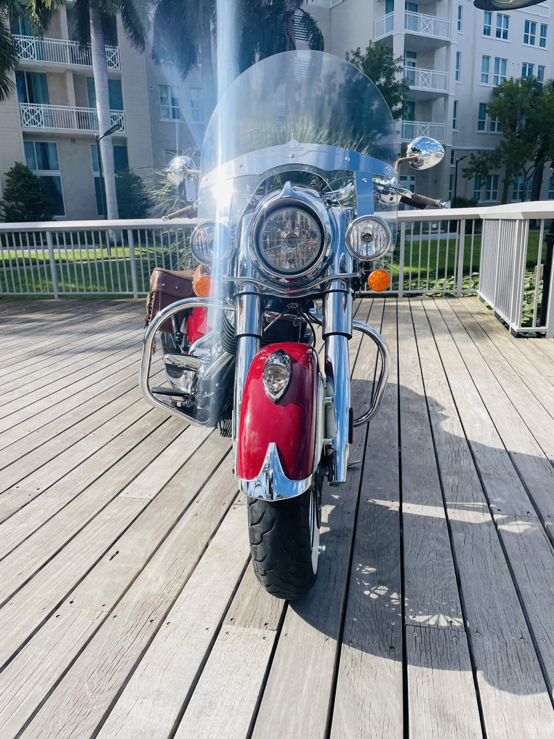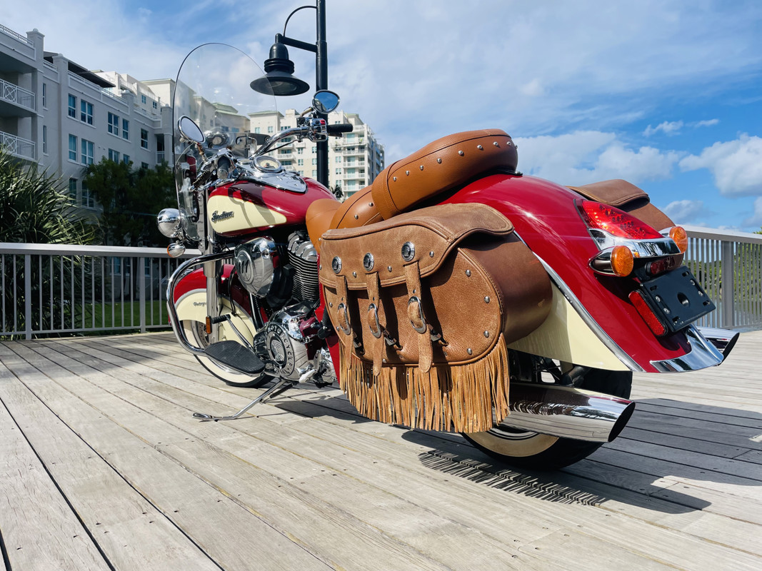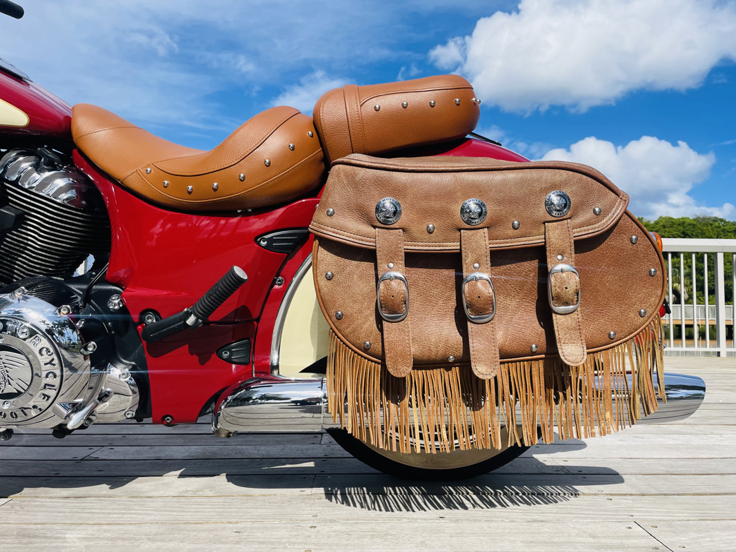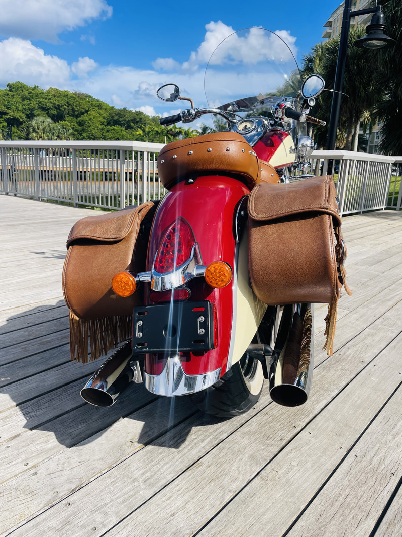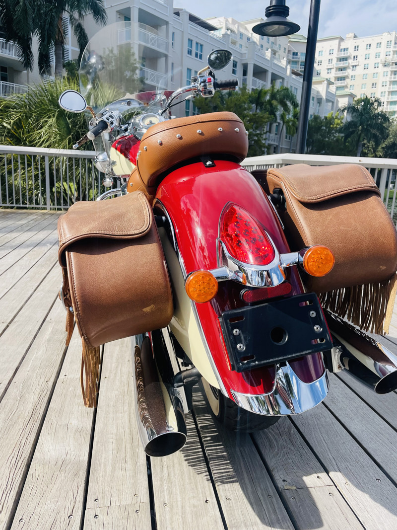 This bike has suffered the indignity of having been stored under cover outside for several years and has some signs of corrosion on various parts and chrome bubbling. The seat (as you can see) has been replaced, the bags are still original since they were off the bike for most of their life. The bike is still one of the prettiest bikes ever produced. The perfect balance of modern machine with an amazing motor and the old classic styling Indian is so well known for. Paint is in good condition with the exception of lower edges on the fenders where some paint bubbles are starting.