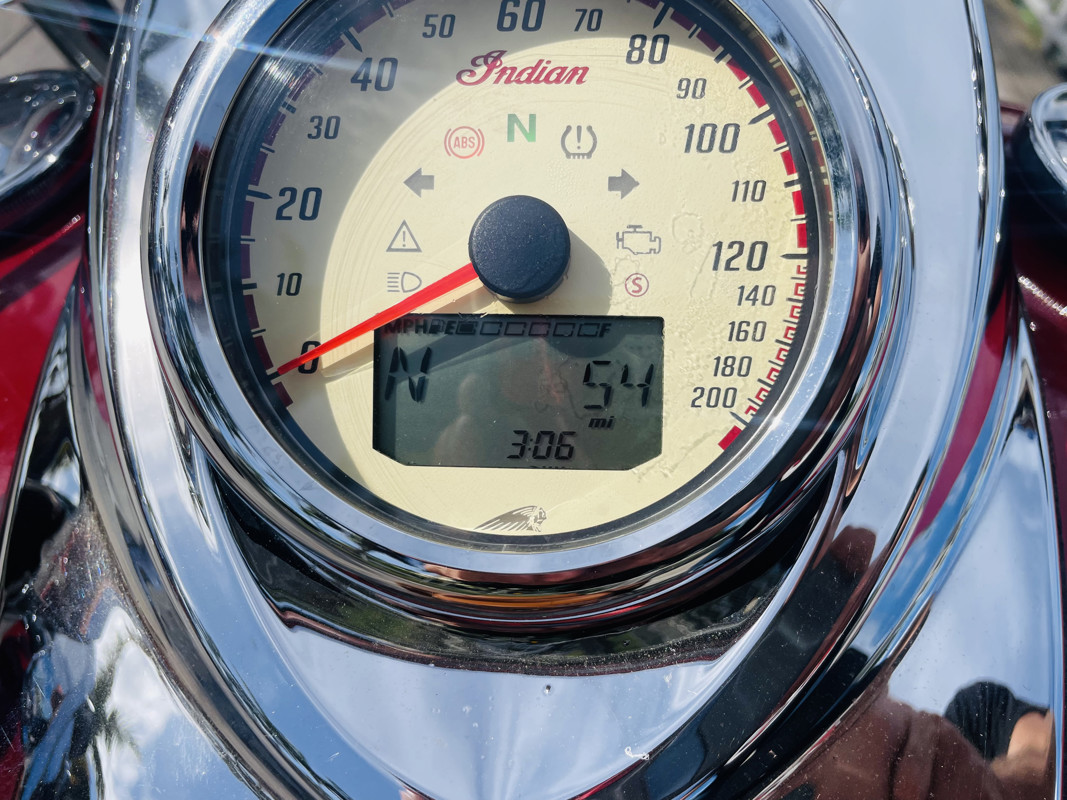 This Chief Vintage is a little bit of a conundrum. It is a one-owner bike with about 2K miles on her. Why “about”? We do not know the exact mileage since the wheel speed sensor was not running for years and the mileage shown on the odometer is 56 miles. How do we know it is about 2,000 then? The tires on the bike are original (therefore have to be replaced by the next owner) and show thread consistent with 2K miles of use. The wheel speed sensor is unfortunately a rather common thing on these bikes. It was just replaced and the bike received a full look over. Speedo and Odo work fine now.