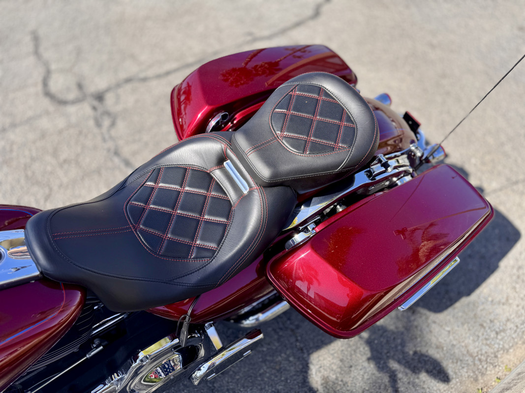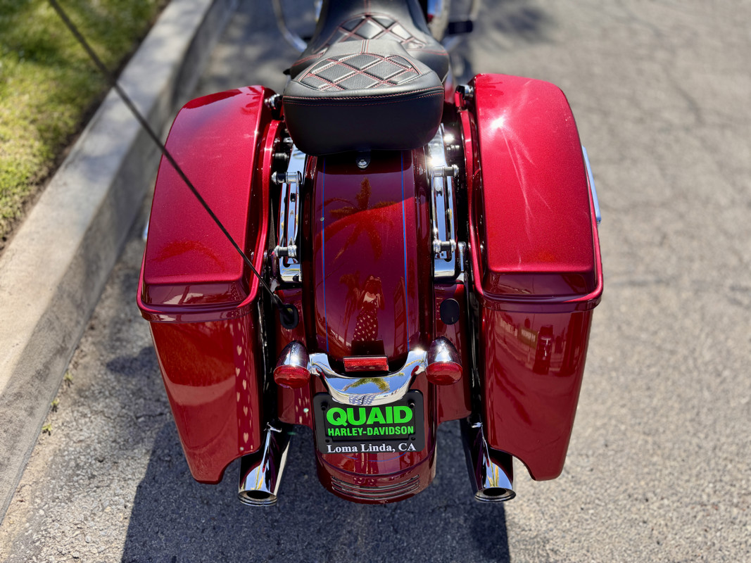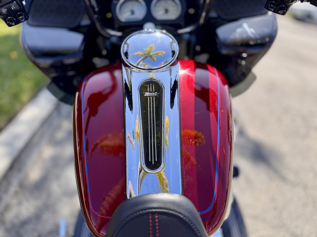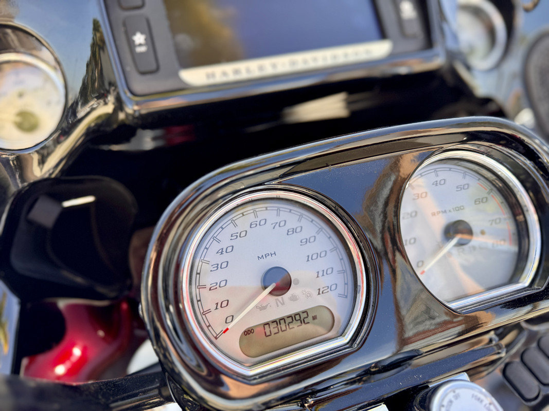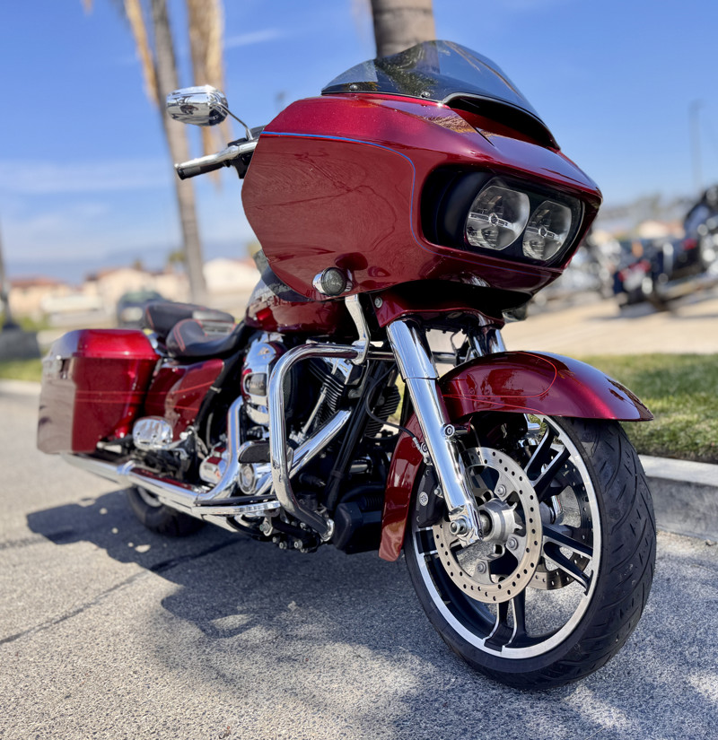 Twin Cam engine, low miles, custom seat with matching red stitching, sharknose fairing, stretched saddlebags.