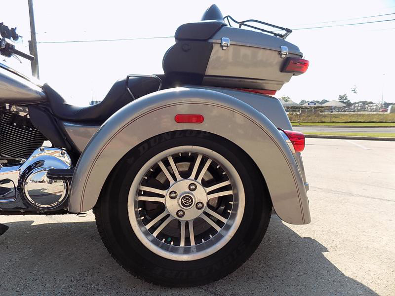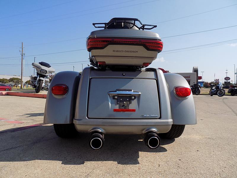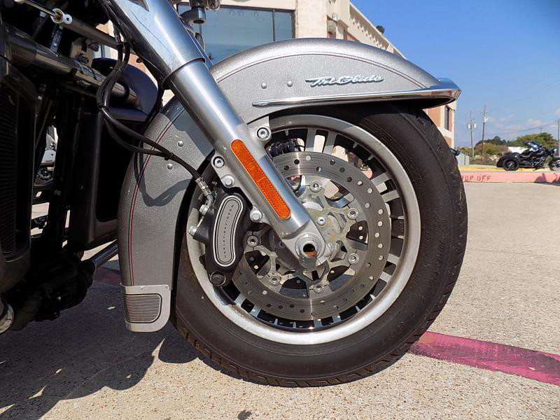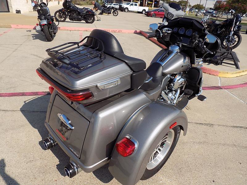 The exterior of the TRI GLIDE ULTRA CLASSIC is finished in a striking Billet Silver with a stylish pinstripe, giving it a sleek and sophisticated appearance. The trike's design is both functional and aesthetically pleasing, ensuring that it stands out in any crowd. The 7 Spoke Black wheels add a touch of elegance and enhance the overall look of the vehicle.