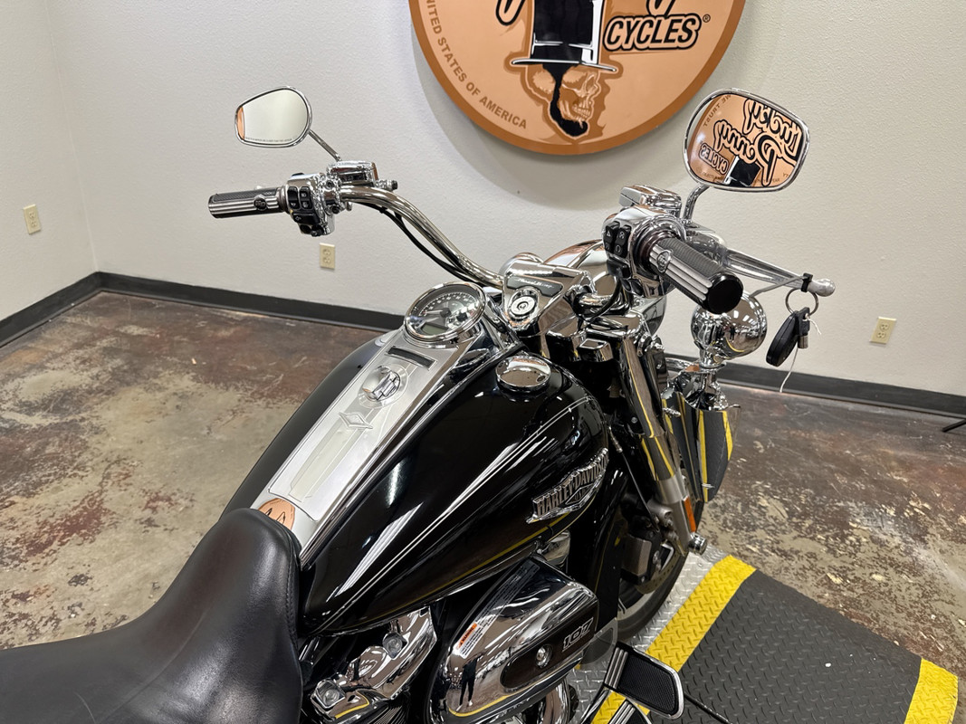 This FLHR Road King has been enhanced with a variety of chrome and comfort upgrades. Chrome controls and a chrome rear brake pedal add a touch of elegance, while banana boards with passenger boards provide ample foot room for both rider and passenger. An upgraded shifter and aftermarket grips offer improved feel and control. Docking hardware allows for easy attachment of accessories, and the studded leather seats provide a classic look and comfortable seating. A heel-toe shifter adds convenience and versatility.