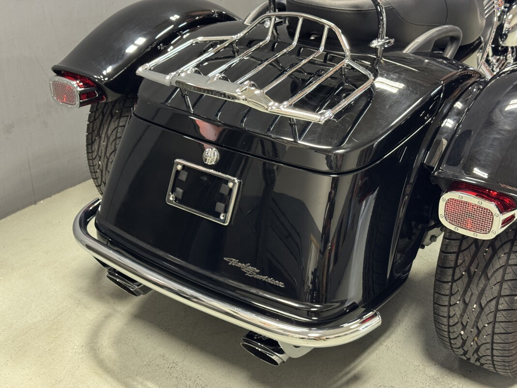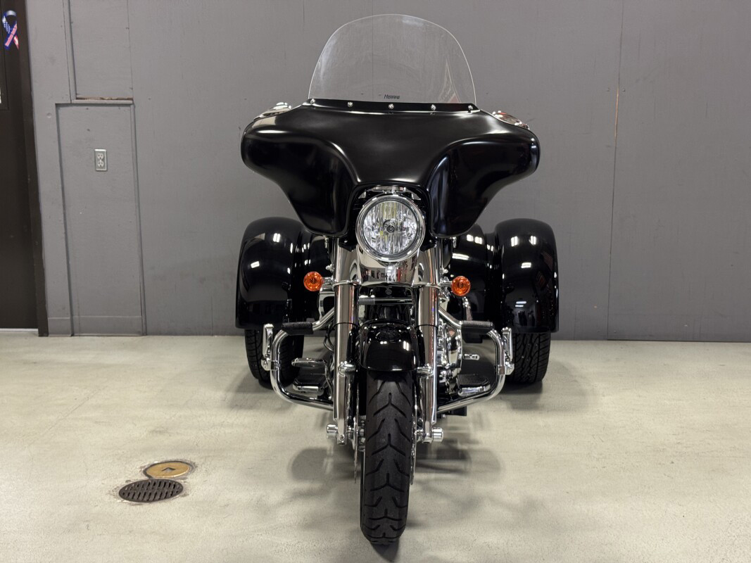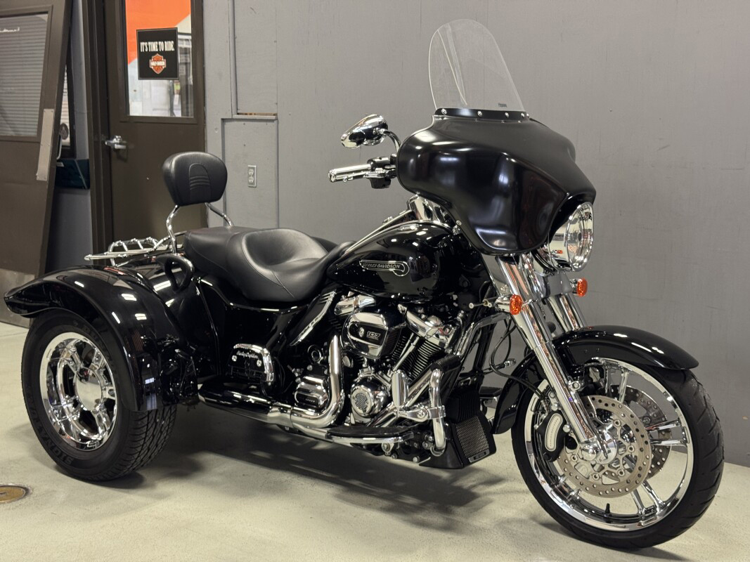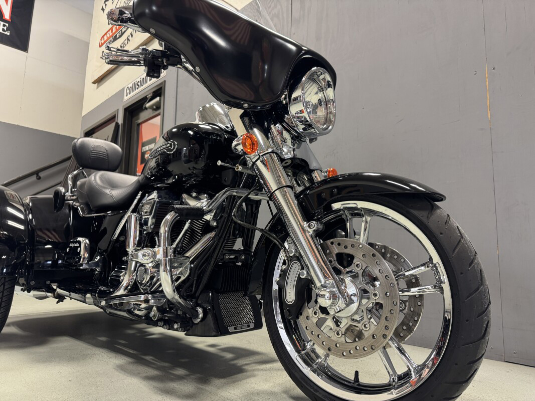 The Freewheeler model puts stripped-down custom style into an easy handling frame that lets you roll with the confidence three wheels gives to a rider. You get classic cruiser lines and styling details, like bobtail rear fenders, slash cut pipes, a chrome headlight nacelle, 12-inch mini-ape hangers and Enforcer aluminum wheels. You also get enough cargo space to hold two full-face helmets plus your extra gear. The acceleration is instant, thanks to the low-end torque of the Milwaukee-Eight 107 engine. And the 49mm front forks and adjustable rear suspension make the ride smooth. They say good things come in threes, and Freewheeler is the proof.