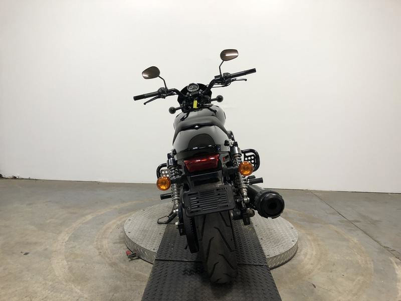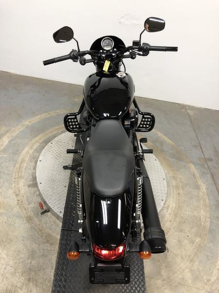 Sports an all-black two-into-one exhaust, black cast aluminum wheels, blacked-out front end with a café inspired speed screen, and a chrome medallion made of steel on the fuel tank.