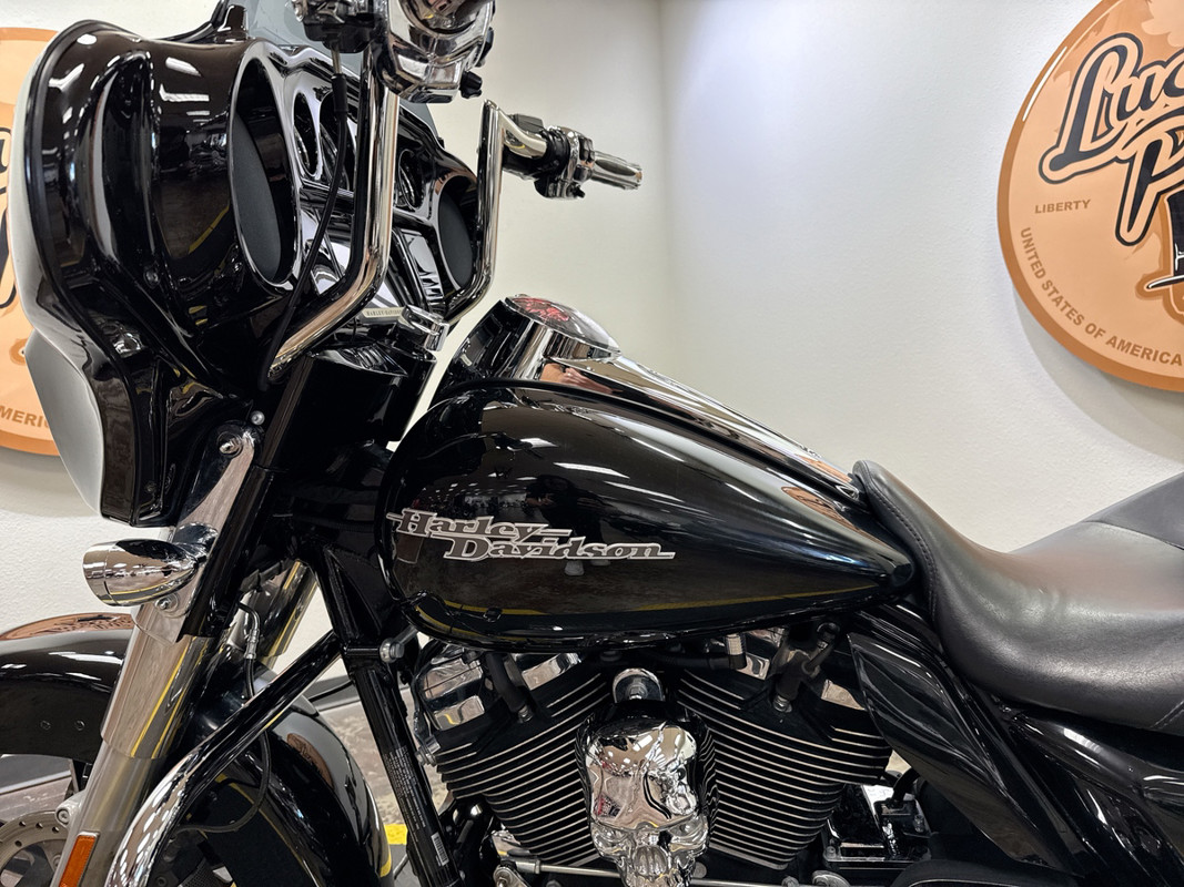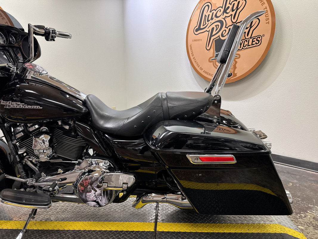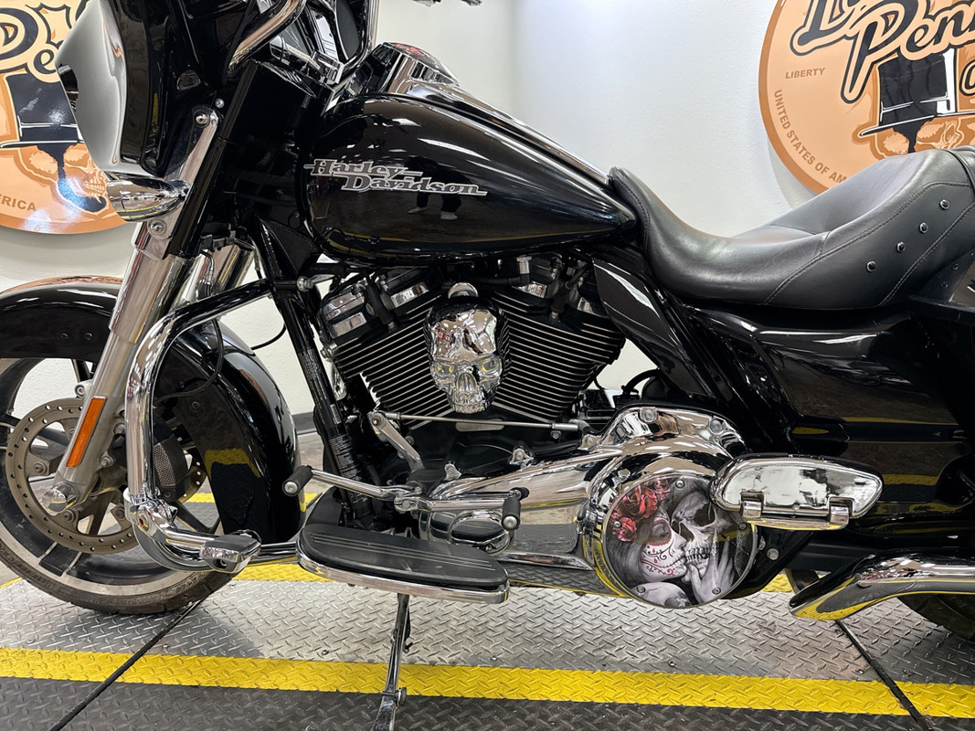 This FLHX Street Glide has been upgraded with a variety of aftermarket parts. A smoked LED headlamp and smoked front passing lights provide enhanced visibility and a modern look. An engine guard adds protection and style. An upgraded rear brake pedal and chrome controls offer improved feel and control. Upgraded skull clutch and front brake levers add a touch of personalization. A black studded leather seat provides a comfortable and stylish riding experience. Smoked rear indicator lights contribute to the bike's sleek profile. Docking hardware and a quick-detach sissy bar add versatility. The Vance & Hines exhaust delivers a throaty rumble, and an upgraded heel-toe shifter provides added convenience. An S&S Cycle high airflow intake improves engine performance.