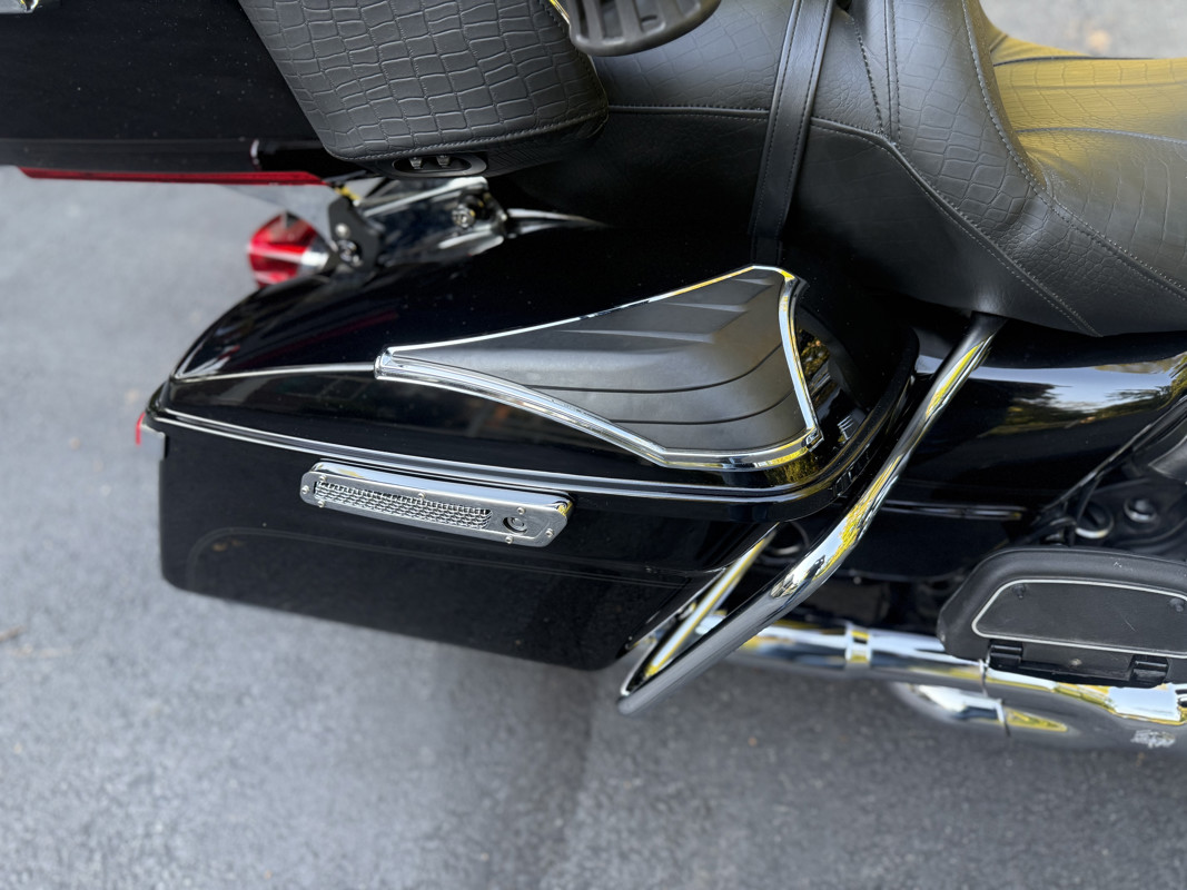 • Includes quick-release tour pack, passenger backrest, and rider backrest — all matching the custom leather