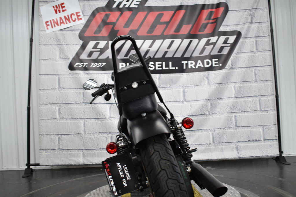 It’s the poster bike of the anti-chrome movement. You’ve got a black powder-coated 883cc engine with black rocker covers. Black on the throwback round air cleaner cover. Chopped fenders, to show off a little rubber and black front forks with gaiters to add a little old-school nostalgia.