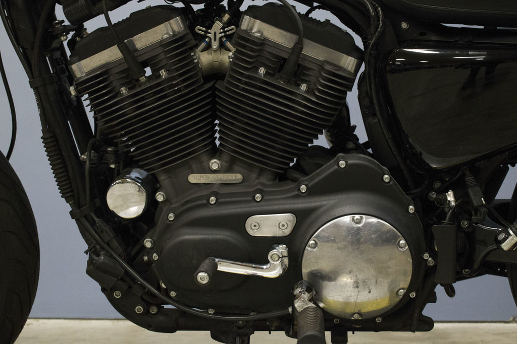 There’s plenty of black to bring a dark edge to the garage-built look of the Roadster™ motorcycle. The mirrors, belt guard and headlamp are black. The oval air cleaner has a black insert. There are slotted black exhaust shields and a blacked-out powertrain.