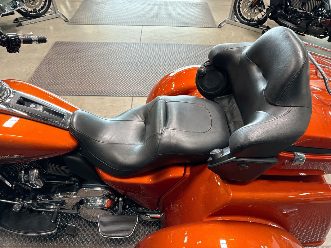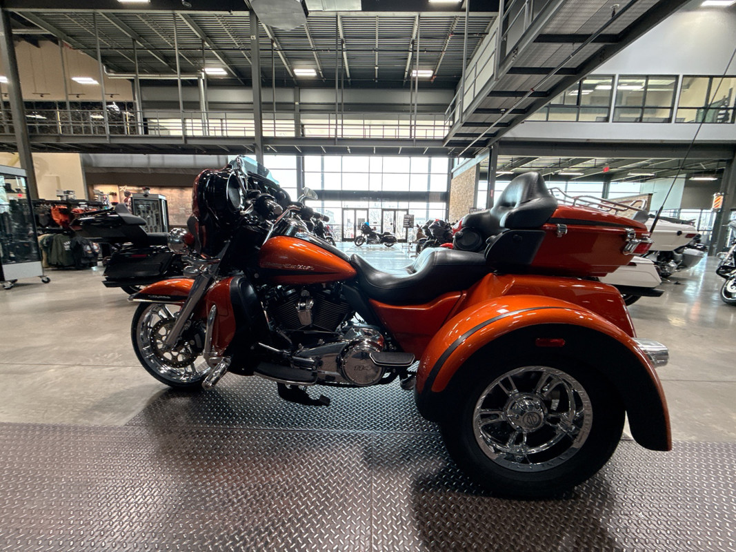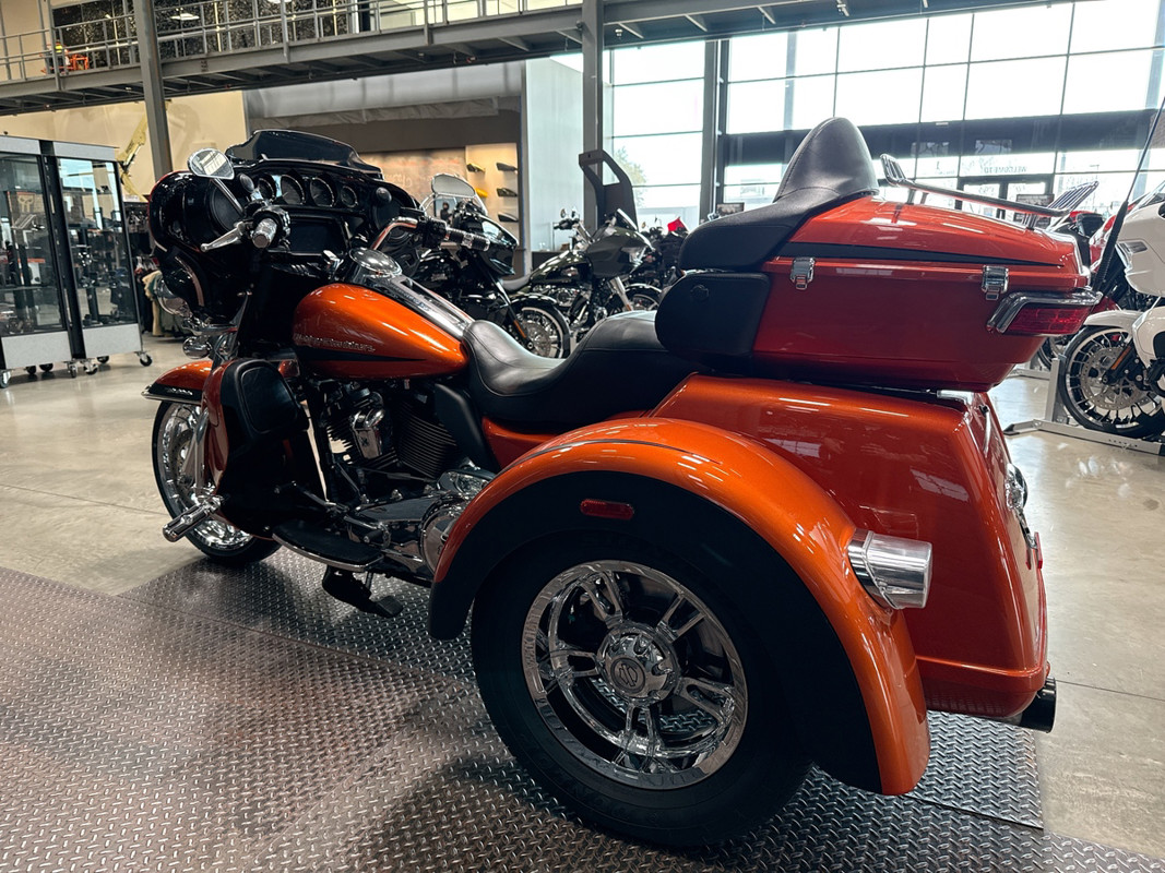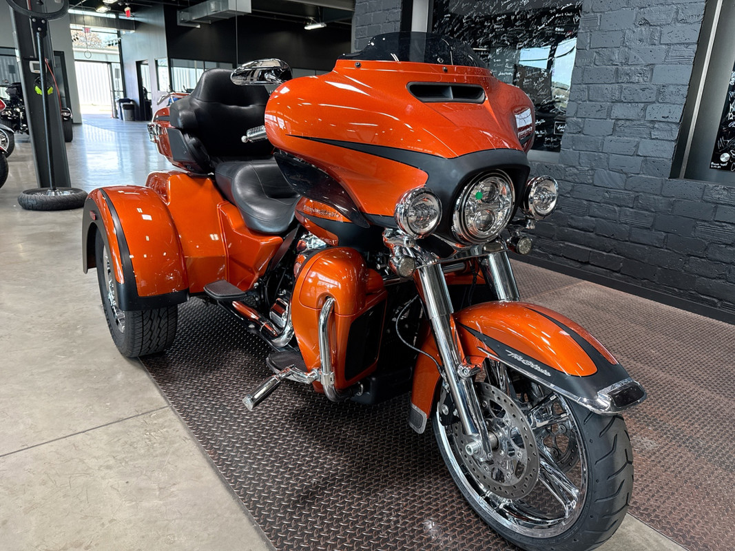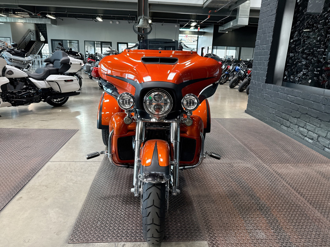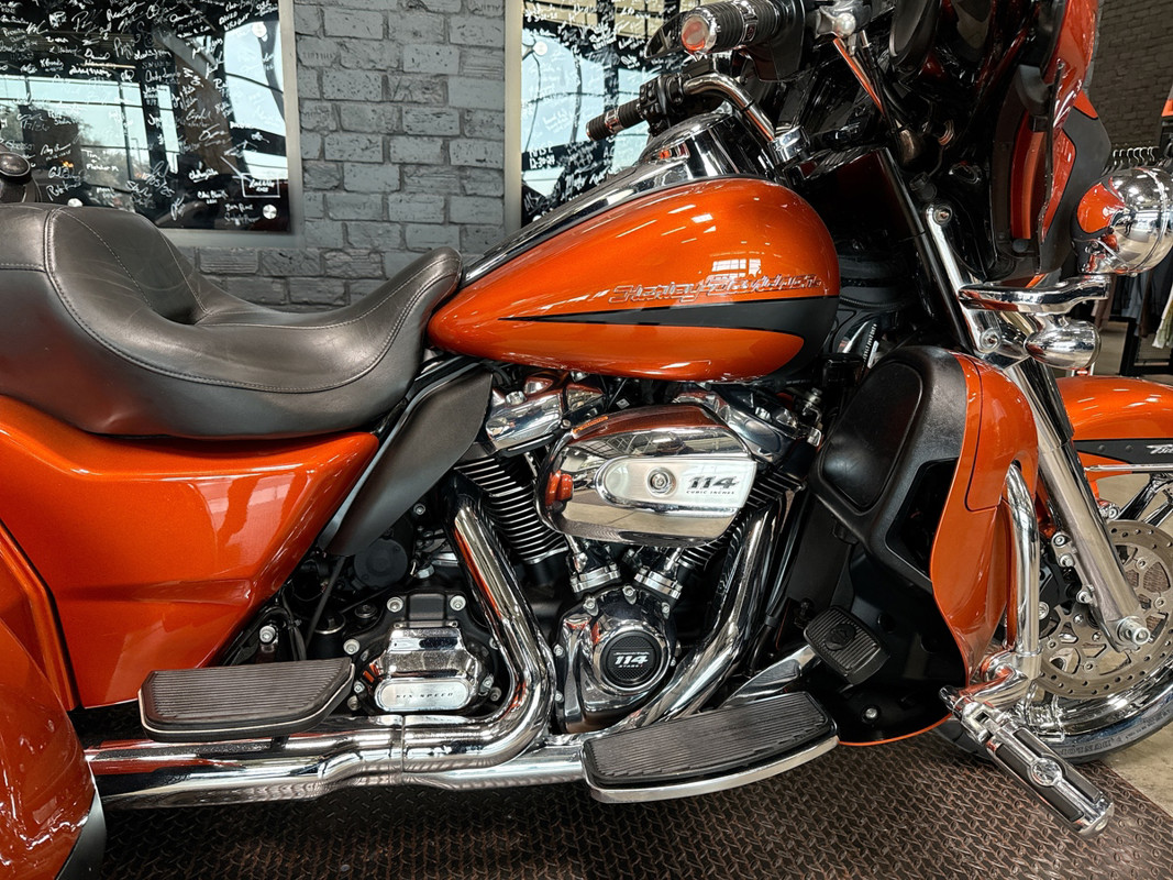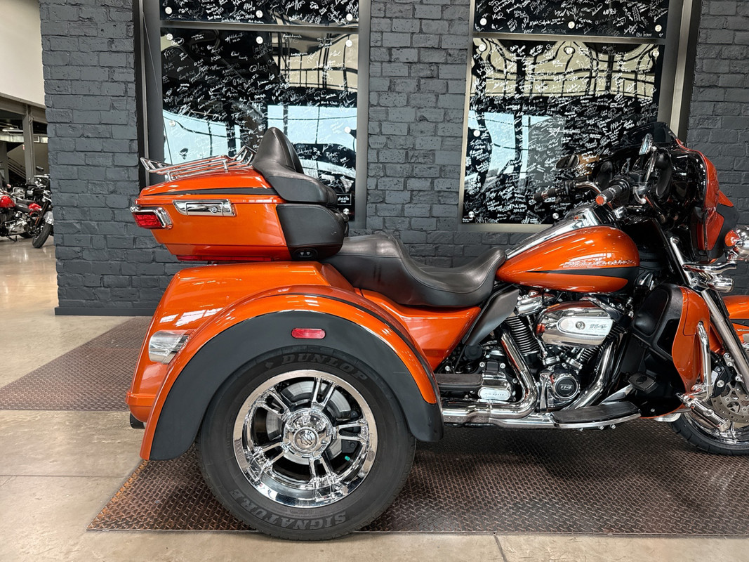 Experience the thrill of the open road with the 2019 Harley-Davidson Tri Glide Ultra, an embodiment of freedom and adventure. With its distinctive Orange/Black Denim finish with pinstripe accents, this trike commands attention and exudes a sense of boldness and authenticity.