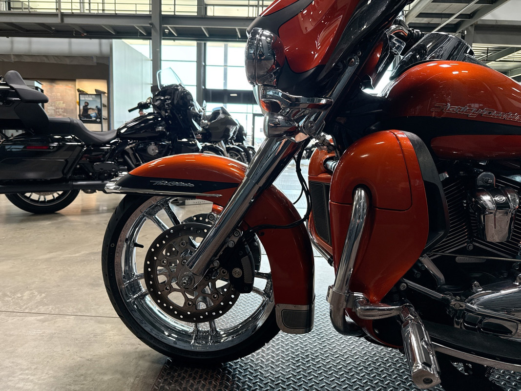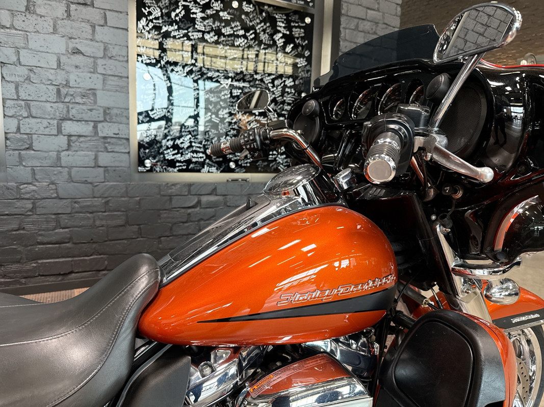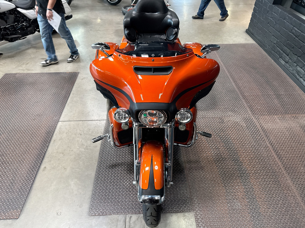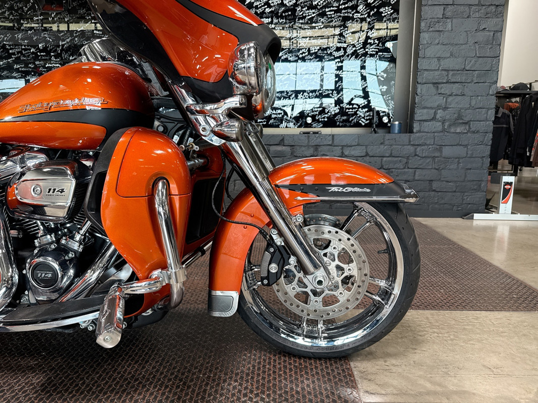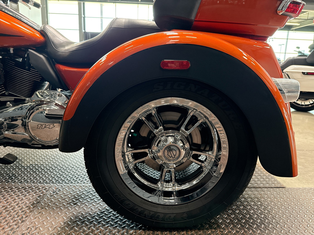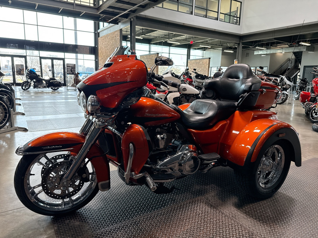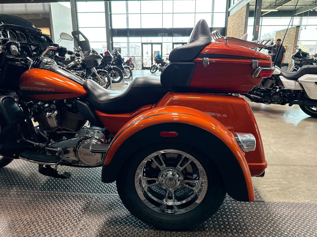 Experience the thrill of the open road with the 2019 Harley-Davidson Tri Glide Ultra, an embodiment of freedom and adventure. With its distinctive Orange/Black Denim finish with pinstripe accents, this trike commands attention and exudes a sense of boldness and authenticity.