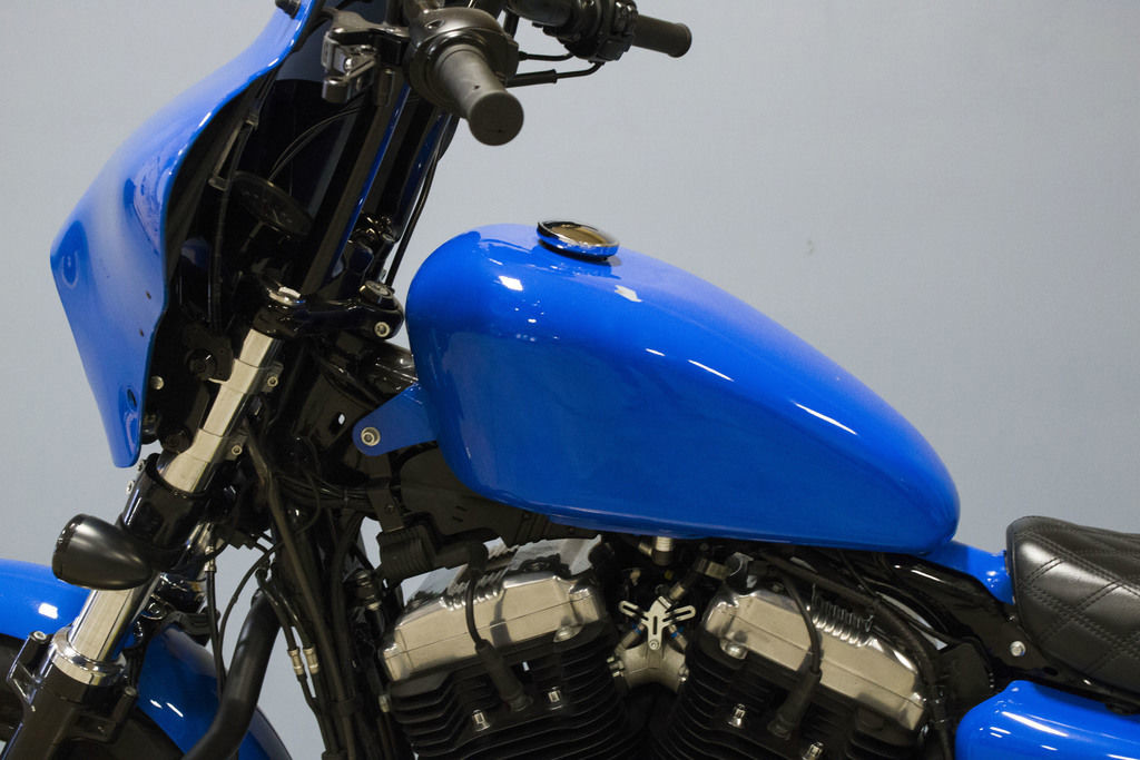 A classic peanut fuel tank design that adds to the machine's low, powerful bulldog look, showing off the solid mass of the engine and the rawboned style of the lean Sportster® frame.