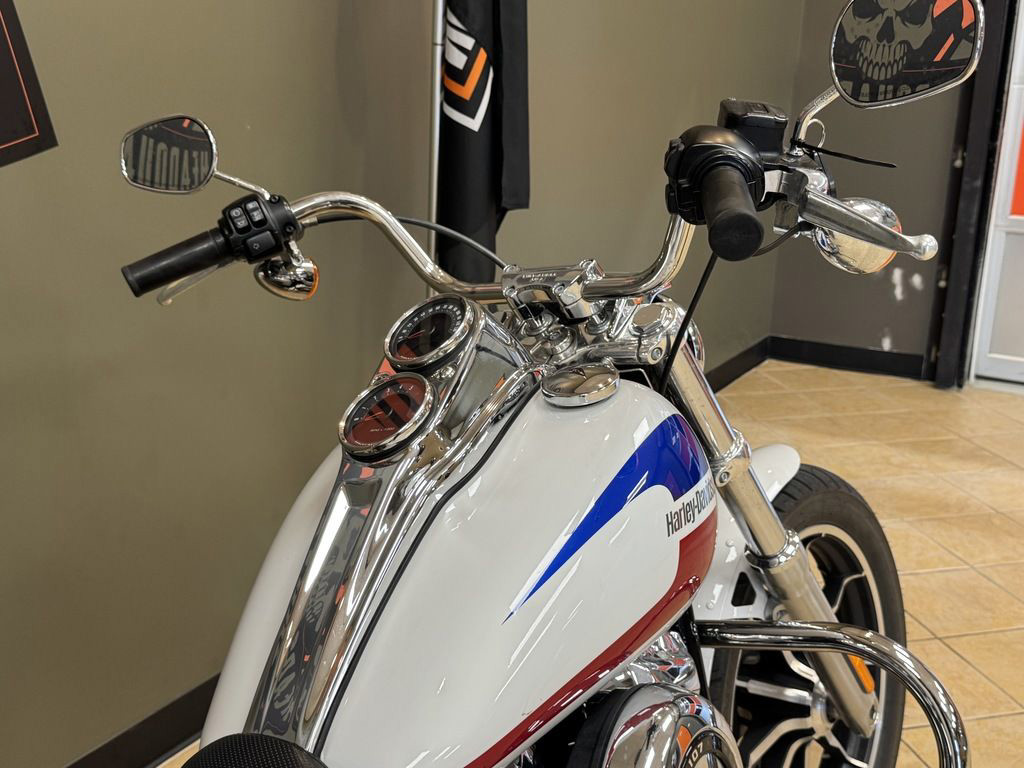 Dual tank mounted gauges, headlight visor and ’70s-inspired tank graphics carry forward the traditional Low Rider motorcycle cues.