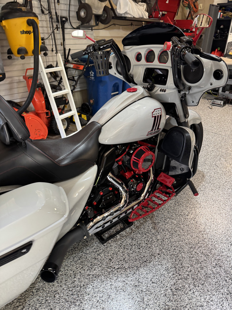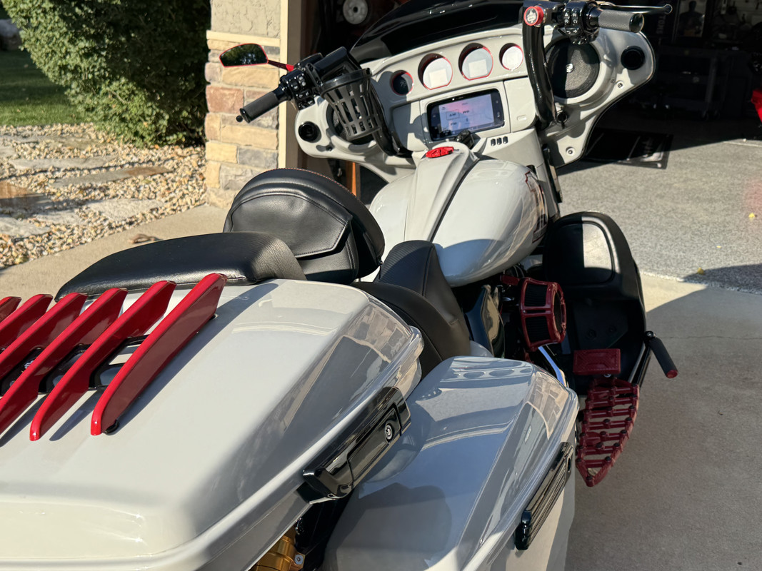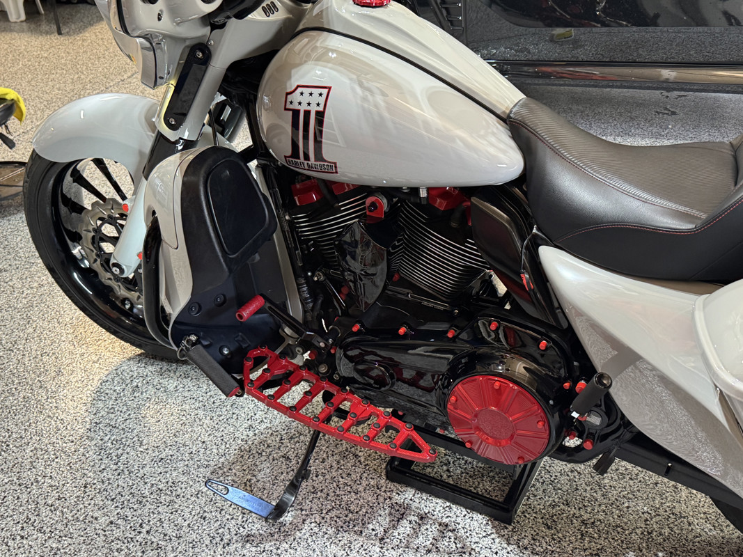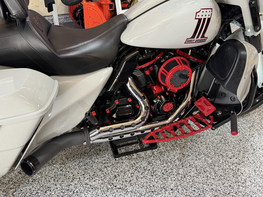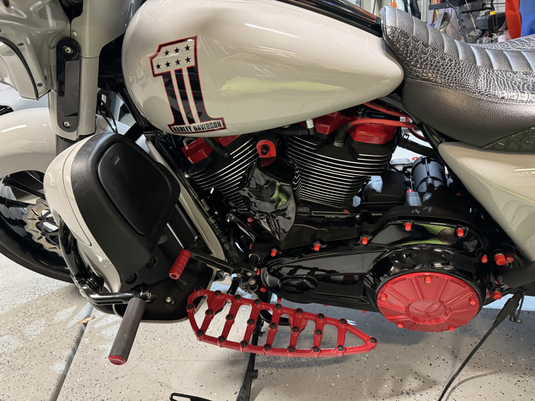 *Arlen Ness footboards, knurled hand grips, passenger footpads, mirrors and Method air cleaner all powder coated red