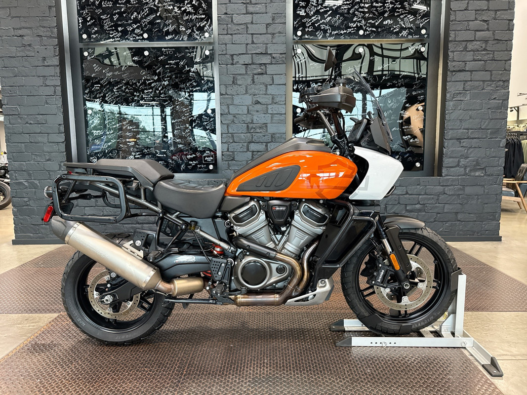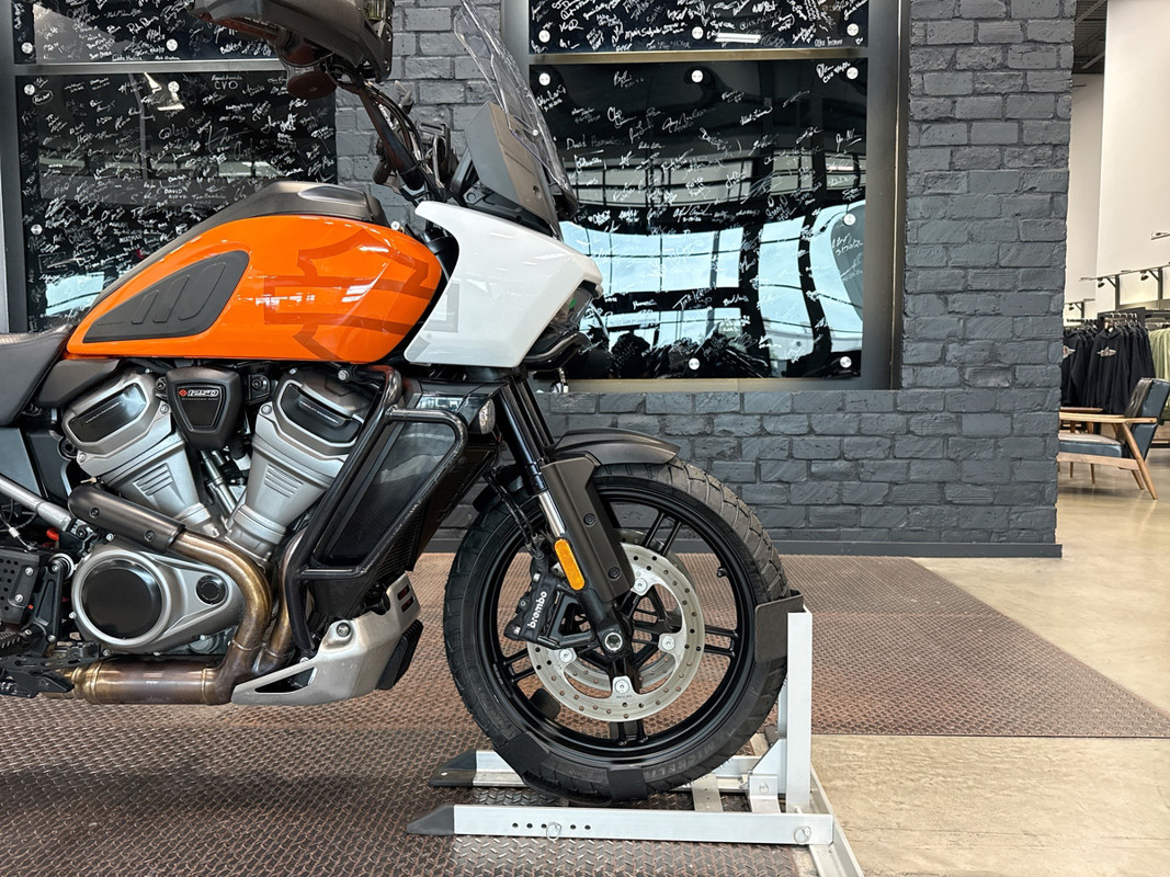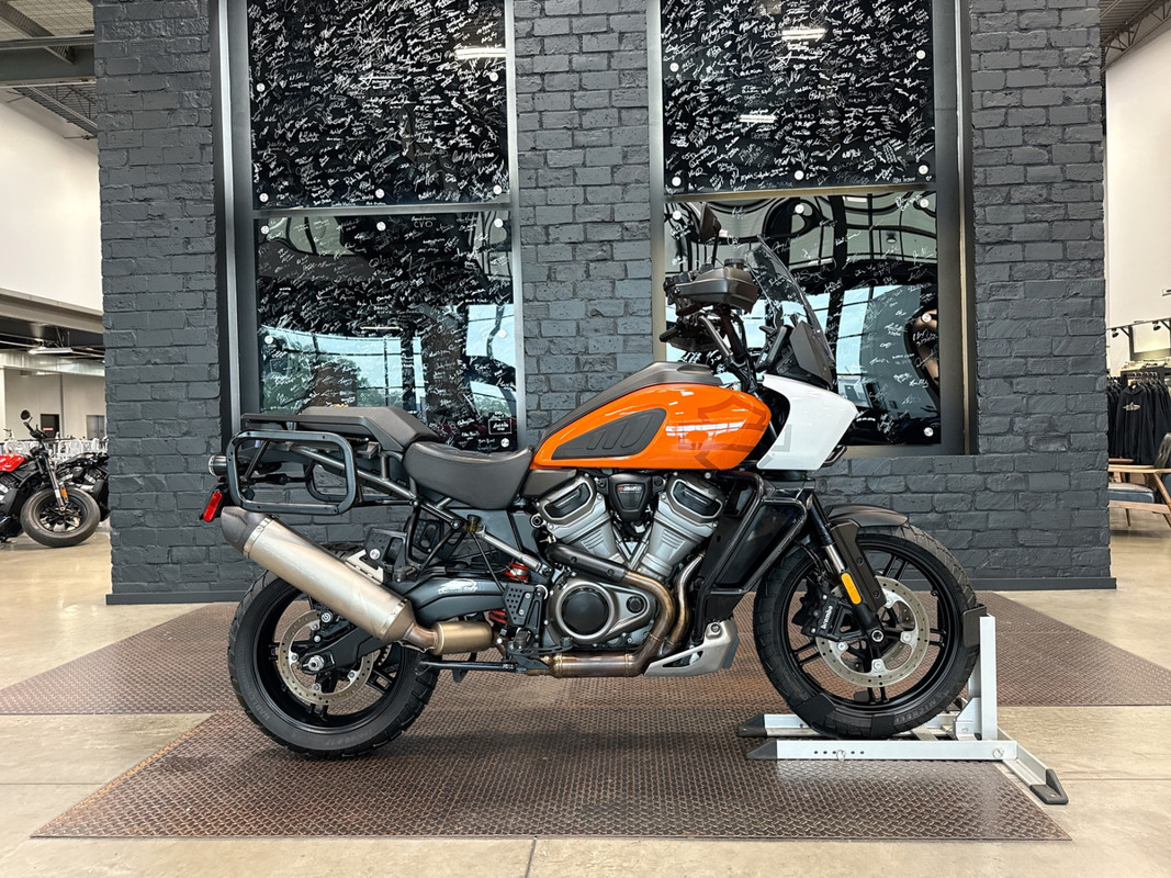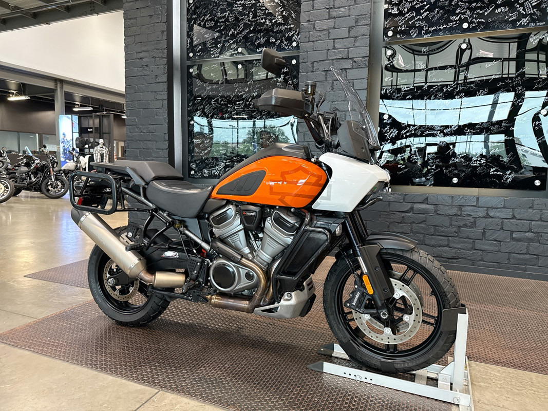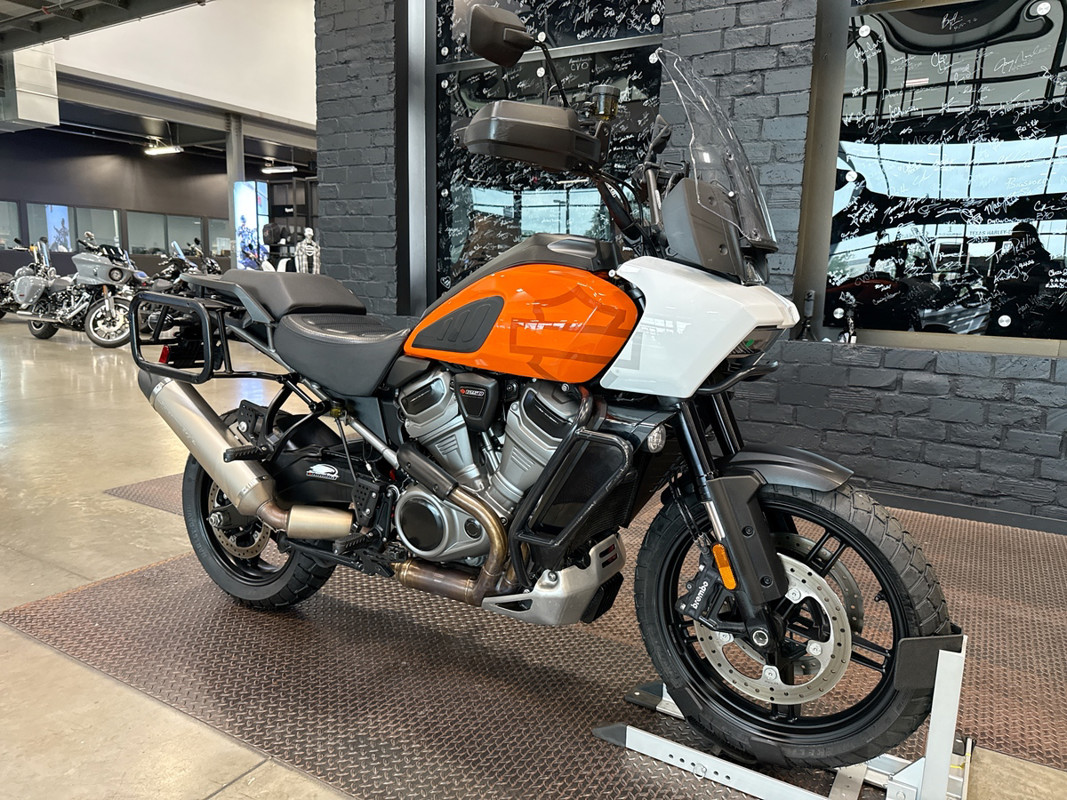 The 2021 HD Pan America Special is a striking motorcycle that embodies both adventure and style. This used touring bike is designed for those who crave the thrill of the open road and the freedom to explore new terrains. With its distinctive BAJA ORANGE/STONE WASHED WHITE exterior, it stands out in any crowd, offering a bold and adventurous look that is sure to turn heads wherever you go.