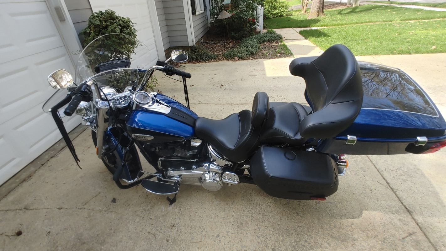 Quick detach 2 tone color matched tour pack with wrap around backrest and LED brake light/turn signal.Quick detach Clearview windshield with recurve lip and 5 position vent. Ultimate 2 piece seat with driver backrest. Kuryakyn adjustable mini boards for passenger. Harley 12v power port on handlebars, on the switch. Heel shifter.Avon air cushions.