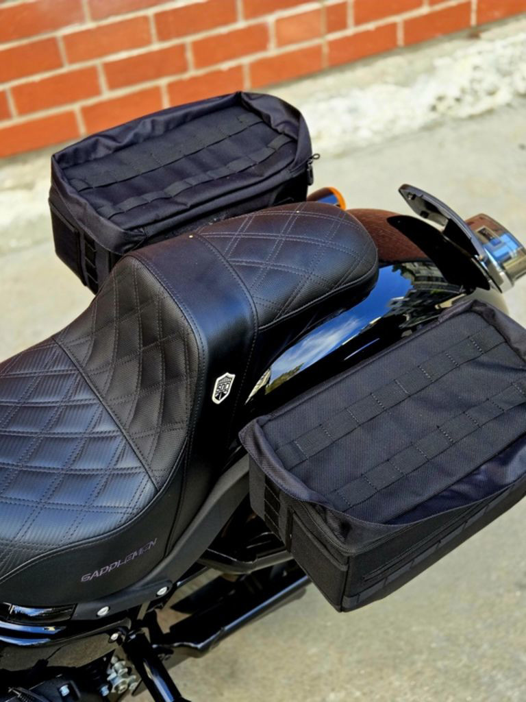 The powertrain, primary cover, triple clamps, top clamp, rear fender supports and tank console are finished in Wrinkle Black; the derby cover, intake, lower rocker covers and handlebar riser are Gloss Black. The handlebar is Satin Black. The forks are anodized black. Mufflers and exhaust shields are Jet Black. An everything black overload, paired with a deep solo seat for lone-wolf attitude.
