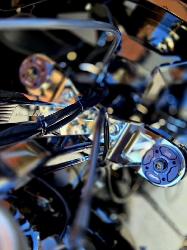 Front end, controls, powertrain and exhaust. The only bright bits are pushrod tubes and tappet covers, and machined cylinder fins.