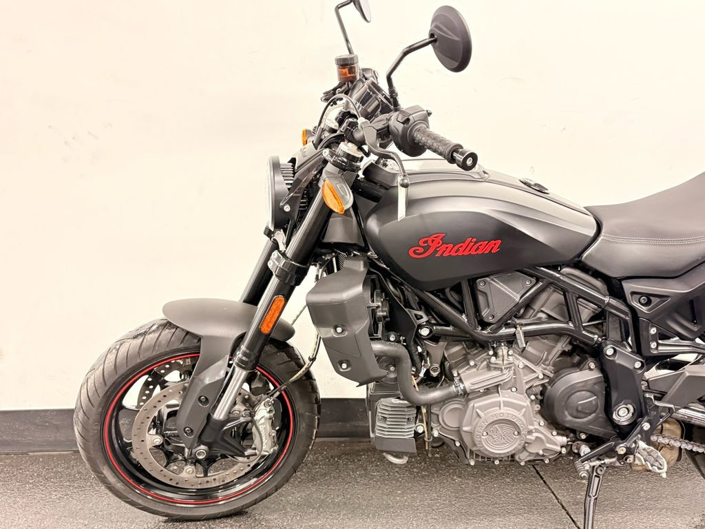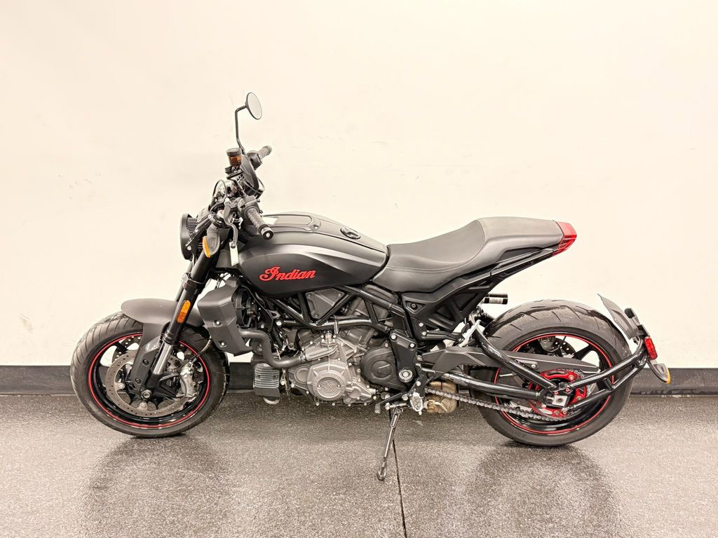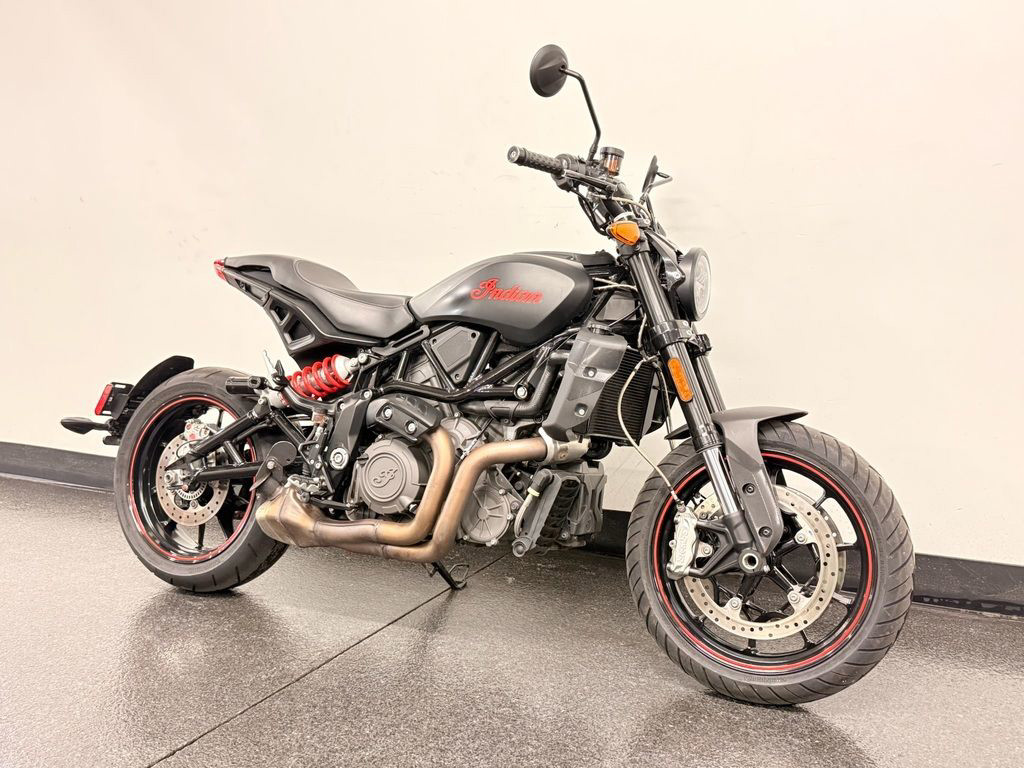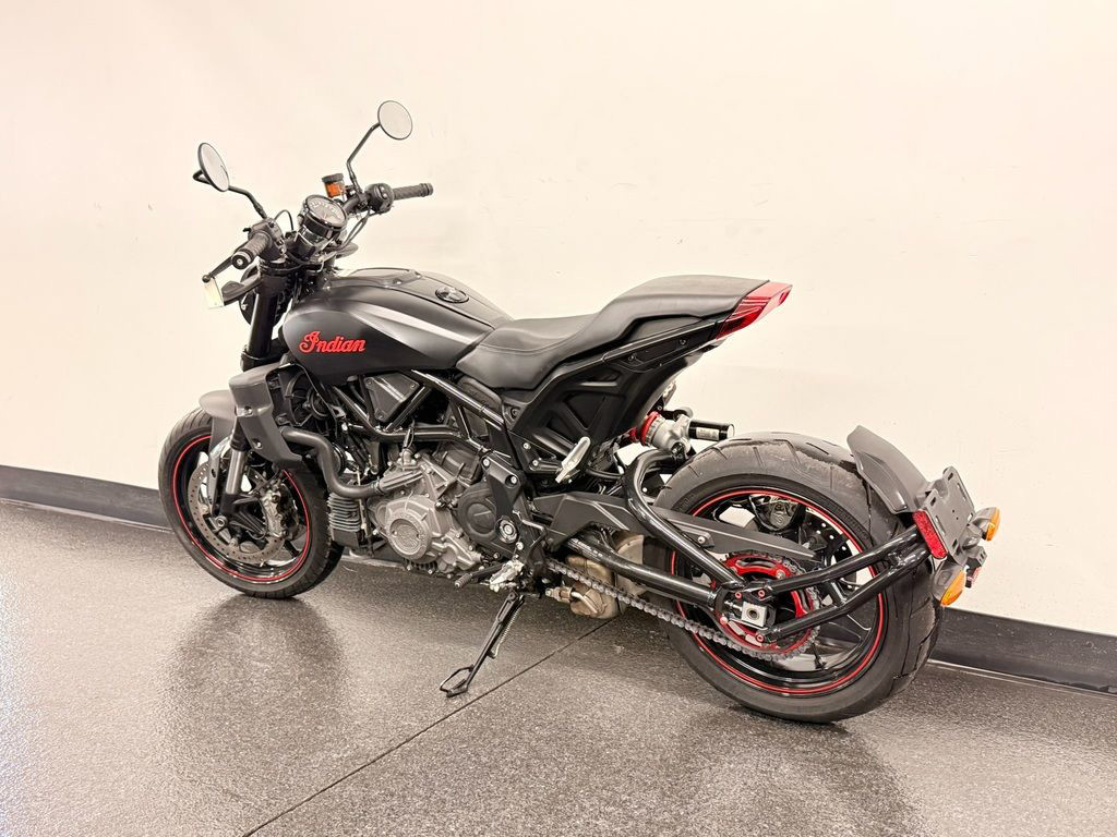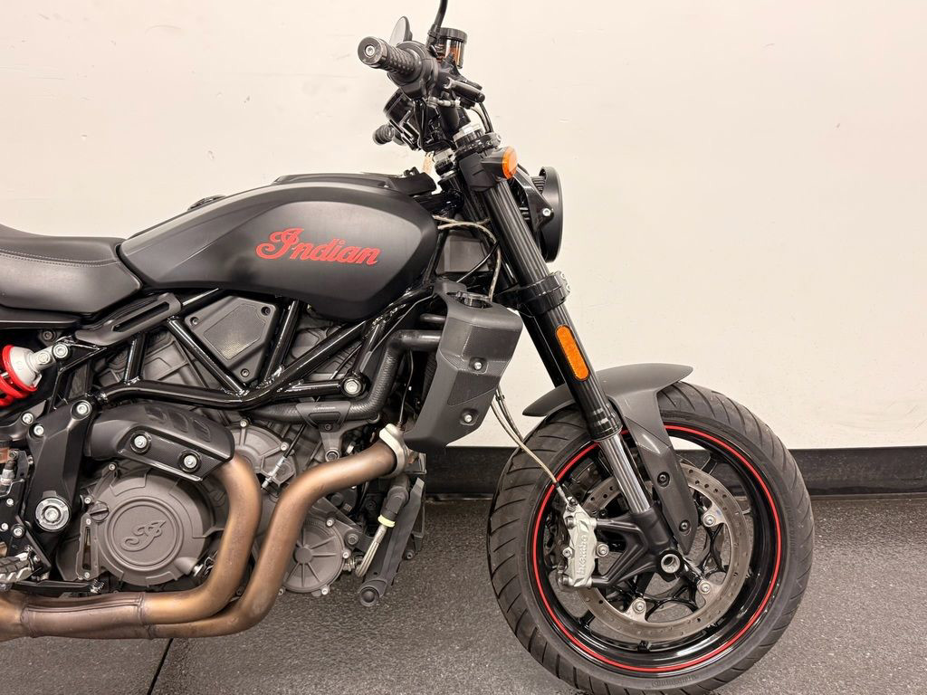 The modern, monochromatic matte-black paint is interrupted by bold red highlights, including the Indian Motorcycle script on the tank, pinstripes on the wheels, and a rear spring that’ll be the last thing they see as you blow by.