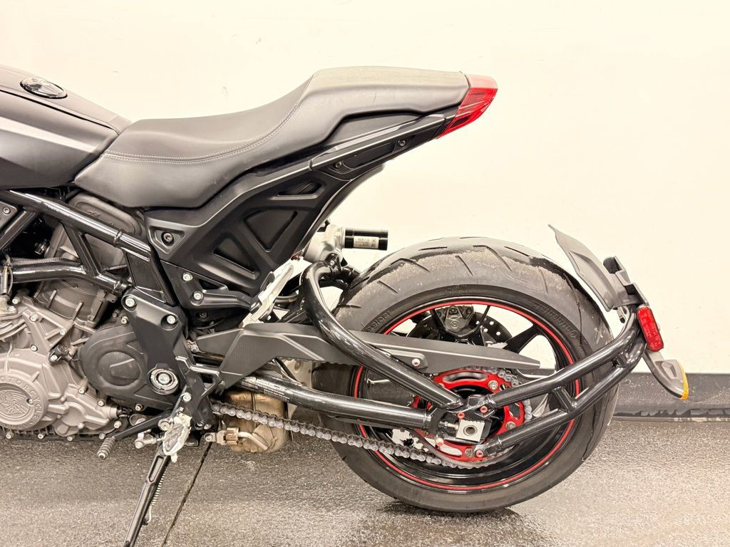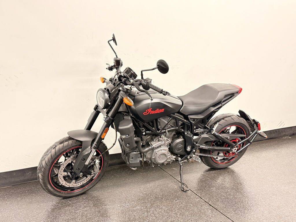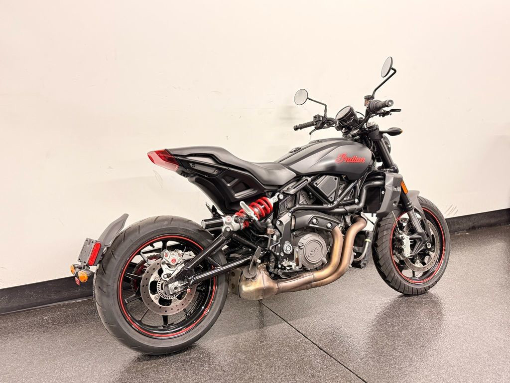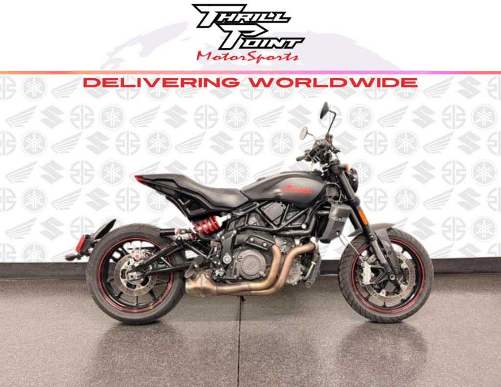 The modern, monochromatic matte-black paint is interrupted by bold red highlights, including the Indian Motorcycle script on the tank, pinstripes on the wheels, and a rear spring that’ll be the last thing they see as you blow by.