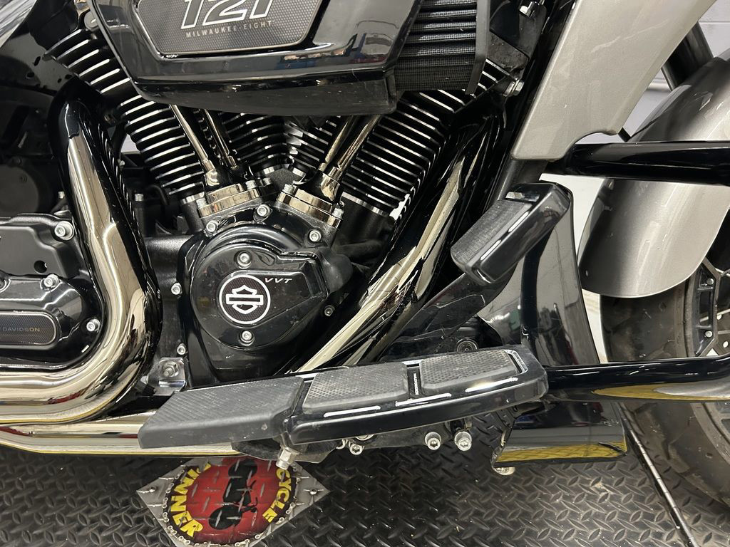 The highest displacement powertrain ever to be factory-installed on a Harley-Davidson Touring motorcycle, the Milwaukee-Eight VVT 121 features liquid-cooled cylinder heads, variable valve timing (VVT) and a new intake tract. The increased displacement produces more power and torque than the Milwaukee-Eight 117 engine, while VVT broadens the overall powerband and improves fuel economy.