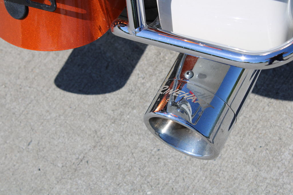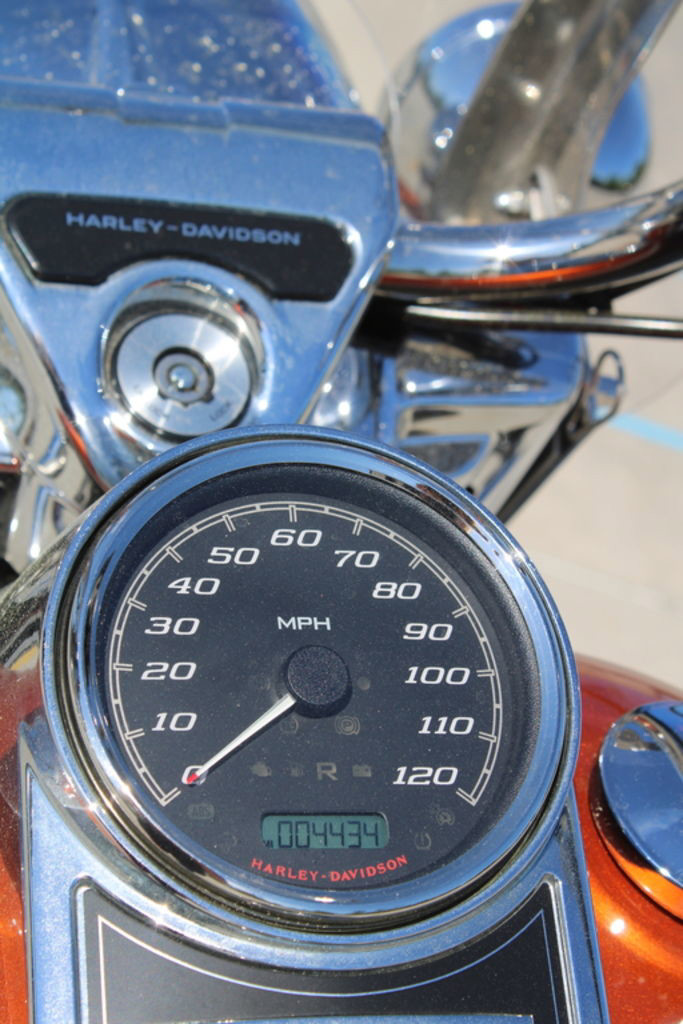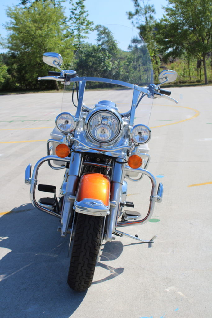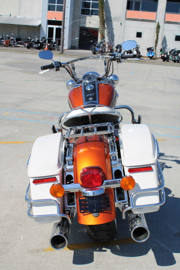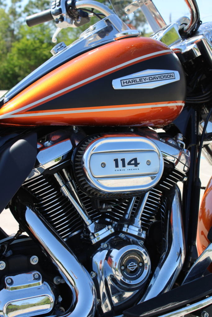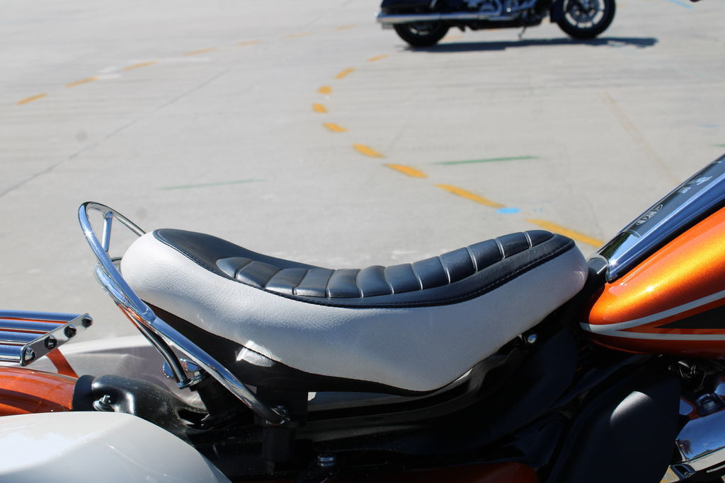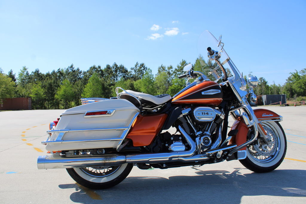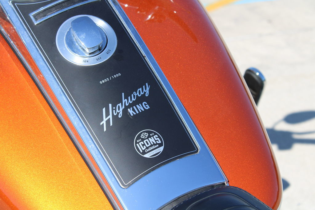 Reminiscent of the stunning two-tone options available in 1968, the Electra Glide Highway King is offered in Hi-Fi Magenta or Hi-Fi Orange accented with Birch White pinstriping and black denim finishing touches.