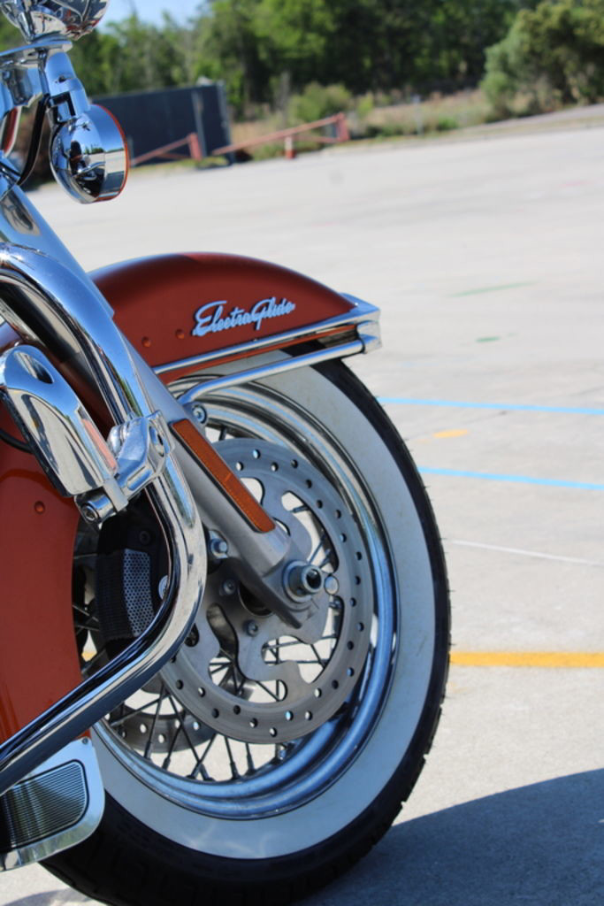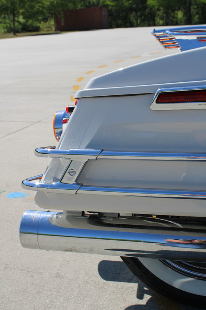 Chrome-finished steel laced wheels, saddlebag rails and fender skirts couple with whitewall tires to complete the period-correct styling.