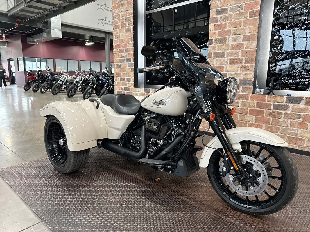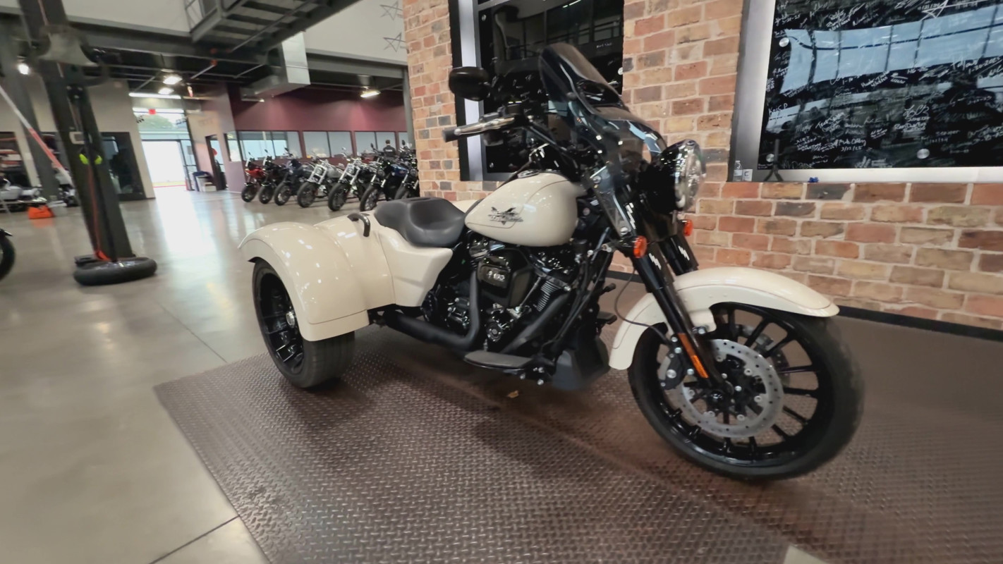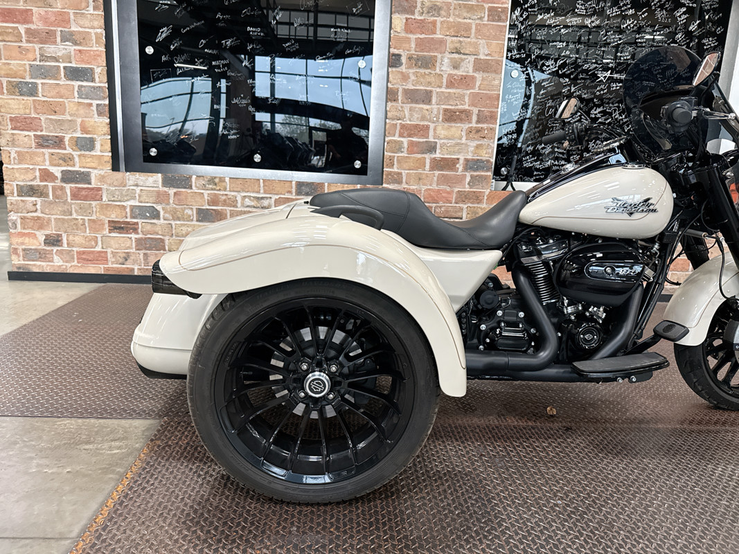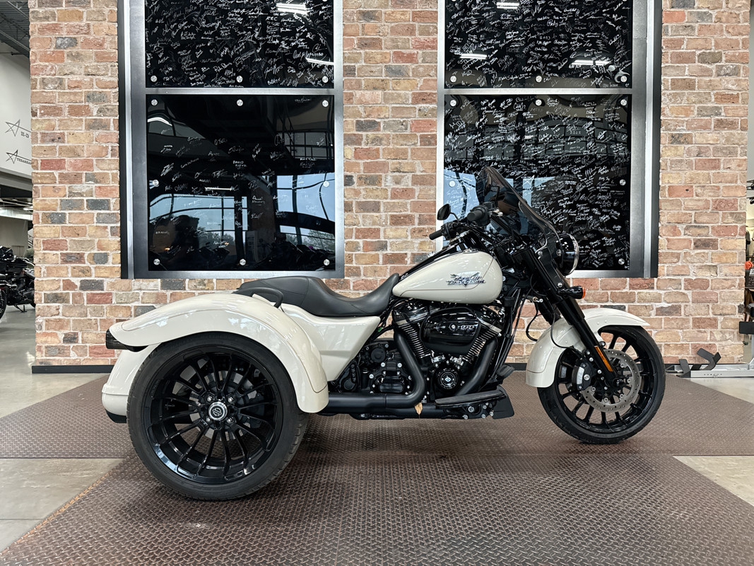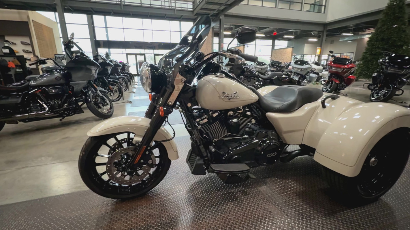 The 2023 Harley-Davidson Trike is a unique and eye-catching vehicle that combines the thrill of a motorcycle with the stability of a three-wheeled design. This particular model is finished in a stunning White Sand Pearl color, which adds a touch of elegance and sophistication to its robust appearance. With only 3,235 miles on the odometer, this used trike is in excellent condition, ready to offer many more miles of adventure.
