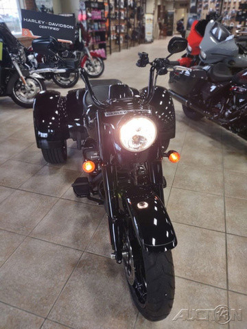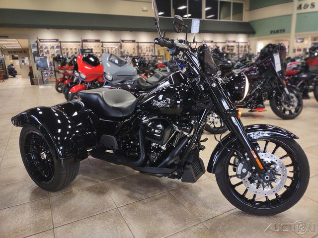 2023 Harley-Davidson® Freewheeler®Cruise with confidence.Hot-rod attitude on three wheels, the 2023 Freewheeler delivers aggressive style, confidence and performance.Features may include:Milwaukee-Eight 114 V-Twin PowertrainBlacked out hot-rod styling and attitude3-Wheel Comfort and performanceTHROW IT IN REVERSEElectric reverse gear makes it easier to move vehicle in and out of parking spaces or a garage.TRUNK SPACEWeather-proof rear trunk with top-mounted door for easy loading.REAR VIEWBobtail rear fenders and slash cut pipe for extra attitude.BLACKED-OUT STYLINGSoaking in blacked-out attitude from the front end, headlamp nacelle, tank console, hand and foot controls to the powertrain and exhaust.CHASSISBuilt on a chassis engineered by Harley-Davidson exclusively for three-wheeled vehicles that offers optimized handling and performance.