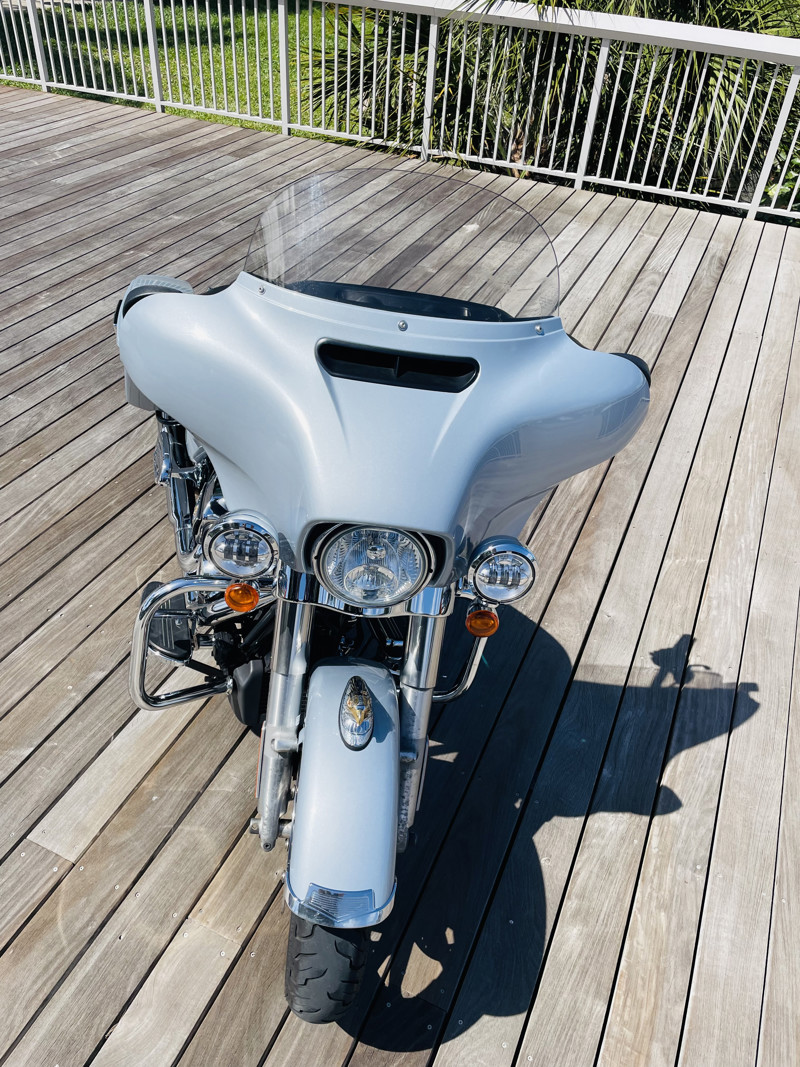 The bike is finished in Atlas Silver Metallic, a stunning silver grey with hint of blue. It shows fresh and new with only two small nicks by the rear seat. Setup for quick connect anything, add a tour case or backrest.