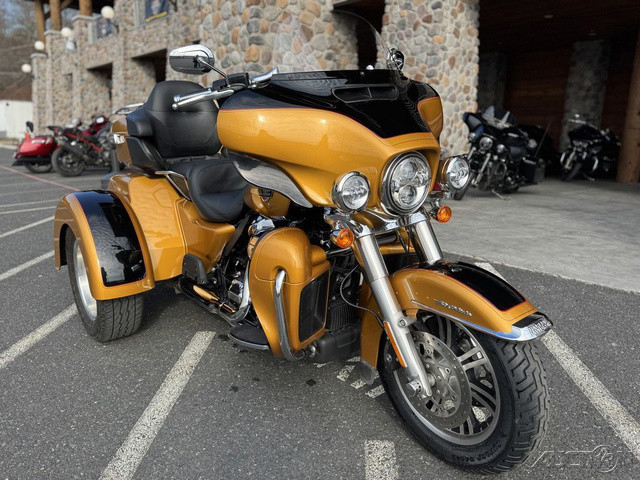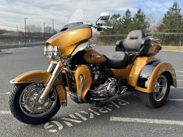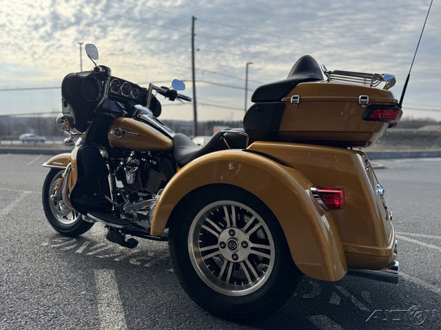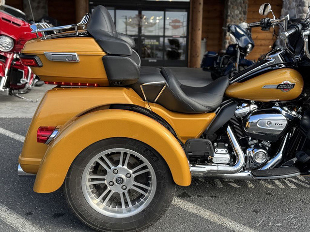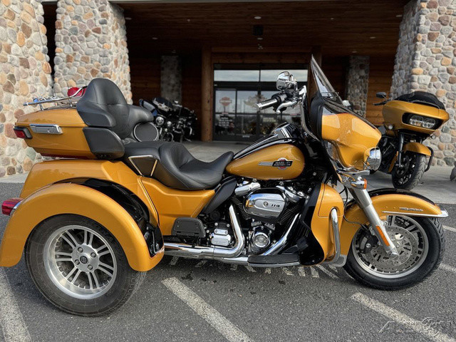 2023 Harley-Davidson® Tri Glide® Ultra Fully loaded and uninhibited.A long-haul touring trike with all the torque, style, premium infotainment and cargo space three wheels can hold.Features may include:Riders seeking a one-of-a-kind 3-wheel touring experienceBold styling with premium paint and Tomahawk™ wheelsTwin-Cooled™ Milwaukee-Eight 114 engine and premium techSADDLE UP IN COMFORTThe ultimate in two-up comfort for riders and passengers looking to log miles and experience new adventures.BATWING FAIRING & SPLITSTEAM AIR VENTDesigned to deliver smoother airflow and reduced head buffeting with a pressure-equalizing duct on the front.BOOM!™ BOX GTS INFOTAINMENT SYSTEMAn evolved interface experience that offers a contemporary look, feel and function, with exceptional durability and features designed specifically for motorcycling. Every element is optimized to enhance the rider’s interaction with the bike and connectivity with the world.TRUNK AND KING TOUR-PAK® STORAGETurn any ride into a weekend trip. The integrated trunk offers 4.4 cubic feet and 50 pounds of storage capacity, while the injection-molded Tour-Pak® luggage carrier adds an additional 2.4 cubic feet storage capacity, combined giving you 6.8 cubic feet of storage.