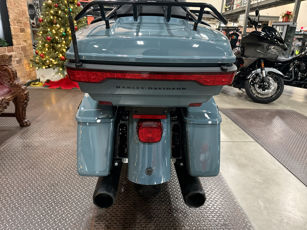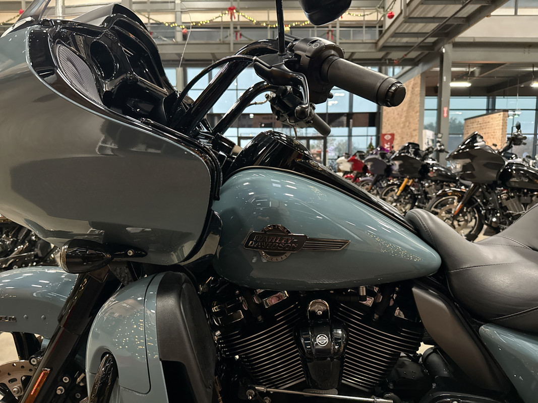 The exterior of this Road Glide Limited is finished in a distinctive Sharkskin color, giving it a sleek and modern appearance. The black accents, including the 7-spoke black wheels, add a touch of elegance and aggression to its overall look. The combination of these colors ensures that this motorcycle stands out, whether parked or in motion.