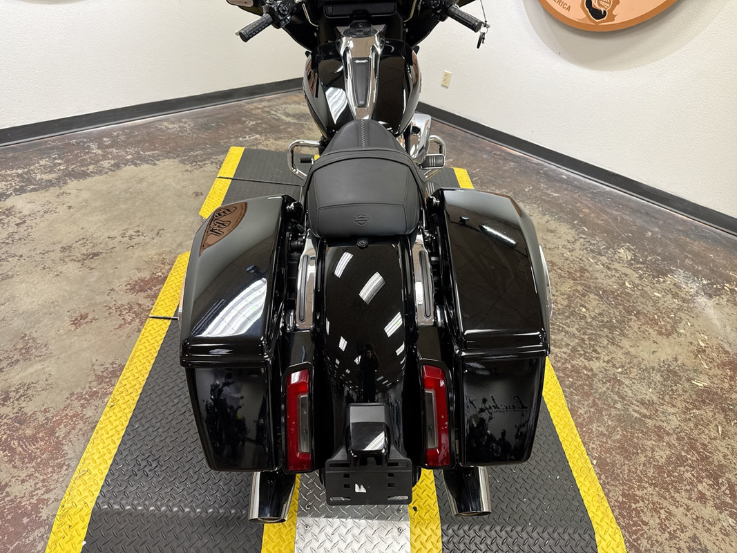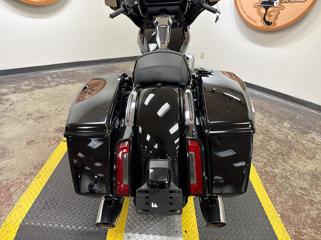 The 2024 Street Glide boasts a redesigned fairing, updated infotainment system, and a host of other improvements that elevate the riding experience. The chrome accents on the engine, exhaust, and trim provide a timeless look that perfectly contrasts the deep black paint. This bike is ready to deliver unforgettable journeys.