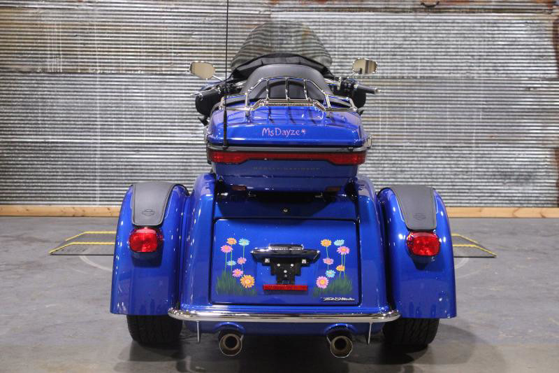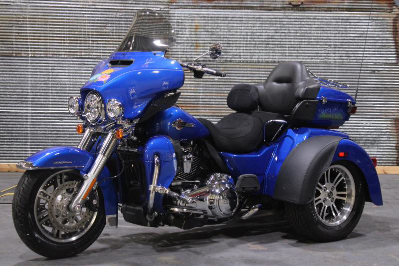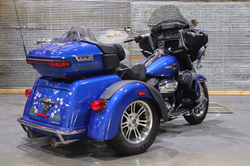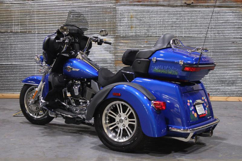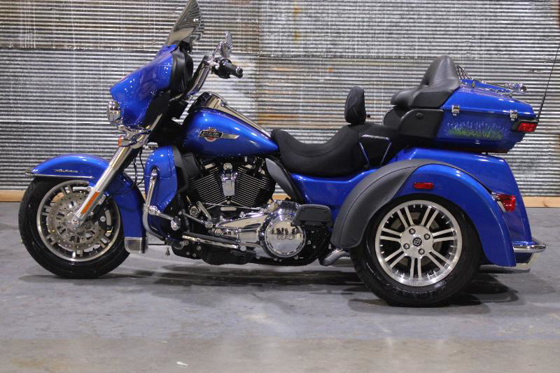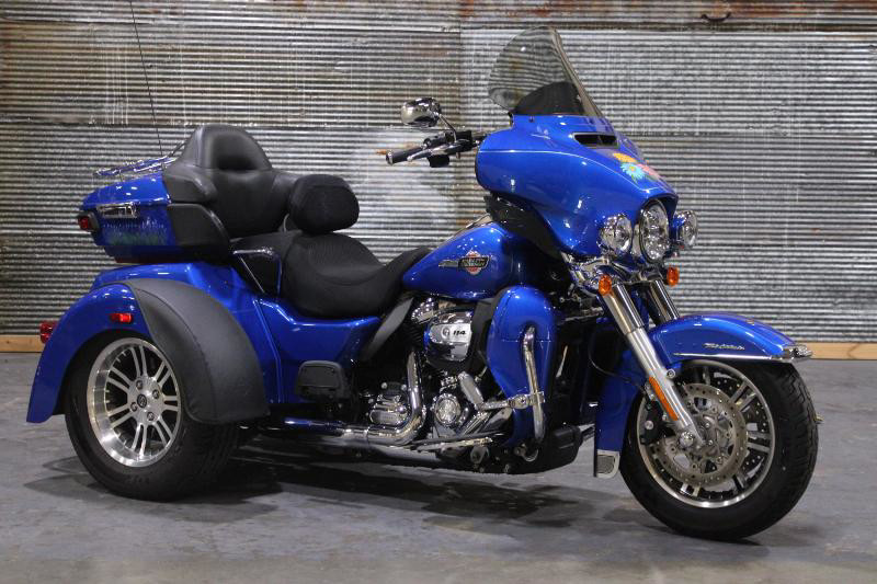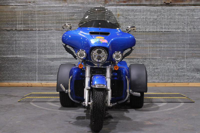 Starting with its appearance, the Tri Glide Ultra grabs your attention with its striking exterior. The vehicle boasts a robust Blue Burst color, elegantly accentuated by a sophisticated pinstripe that traces its curvaceous body. Its commanding presence is further enhanced by the unmistakably Harley-Davidson aesthetics, highlighting a perfect blend of sportiness and luxury.