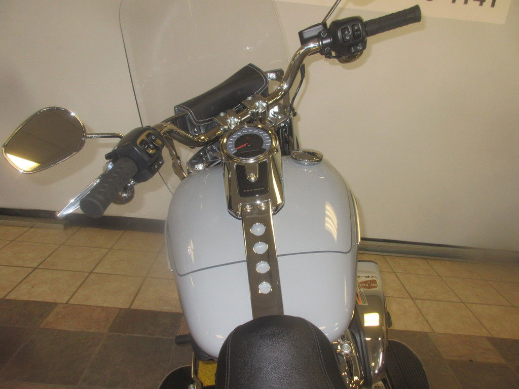The iconic Fat Boy headlight nacelle shines in bright polished chrome, accentuating the large and muscular look of the front end.
