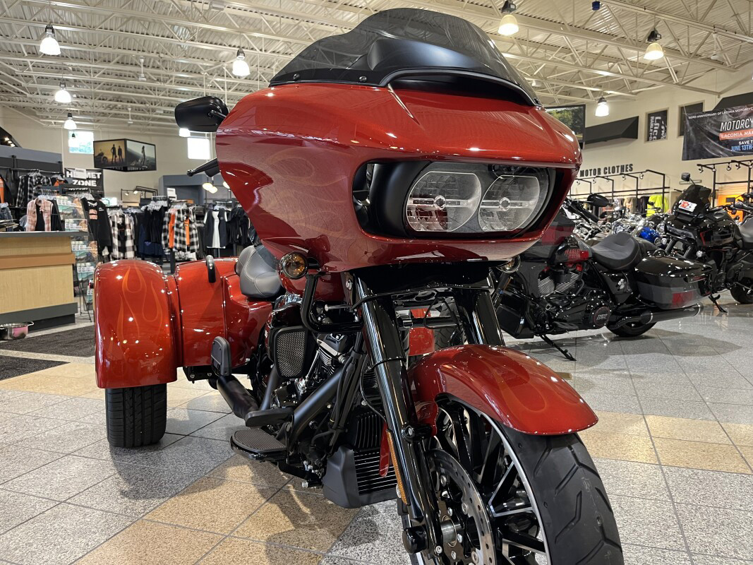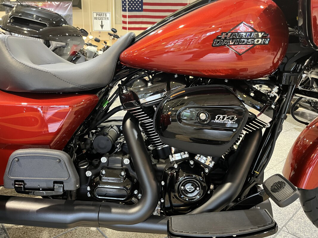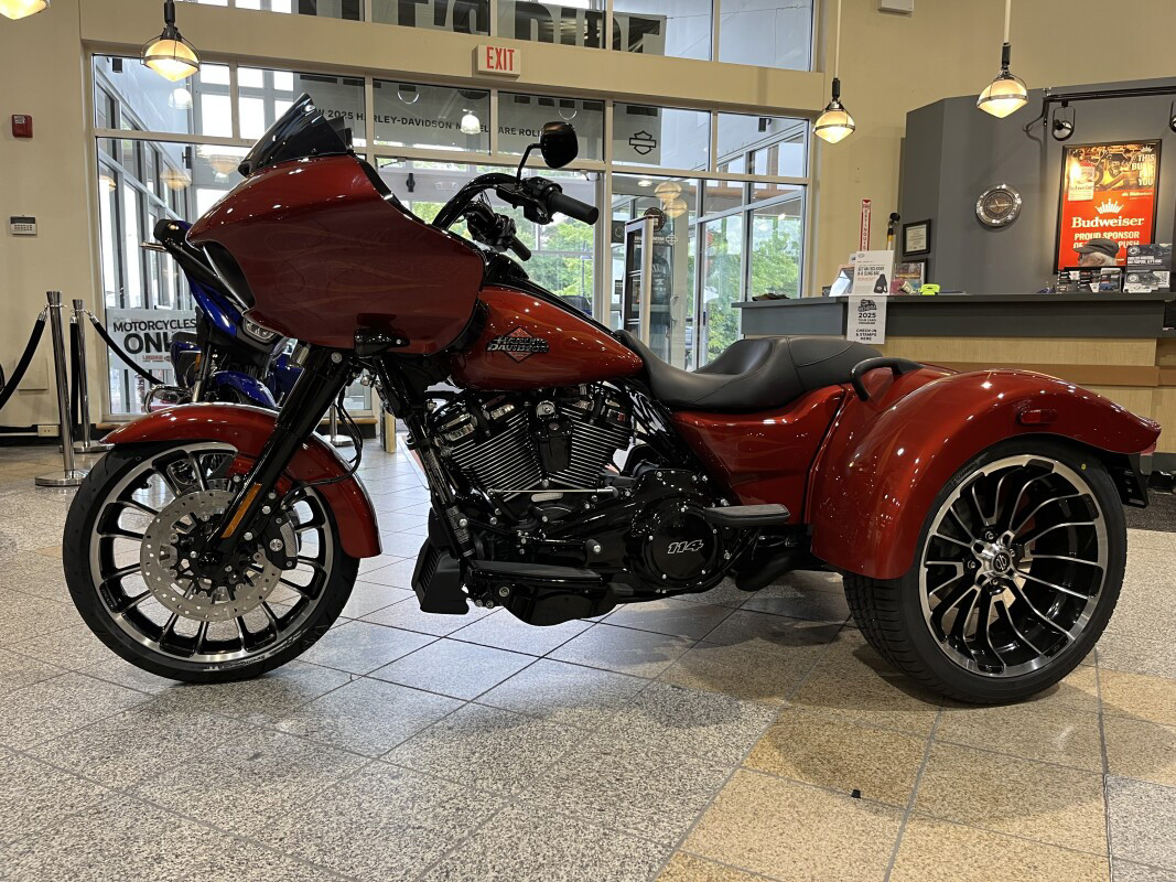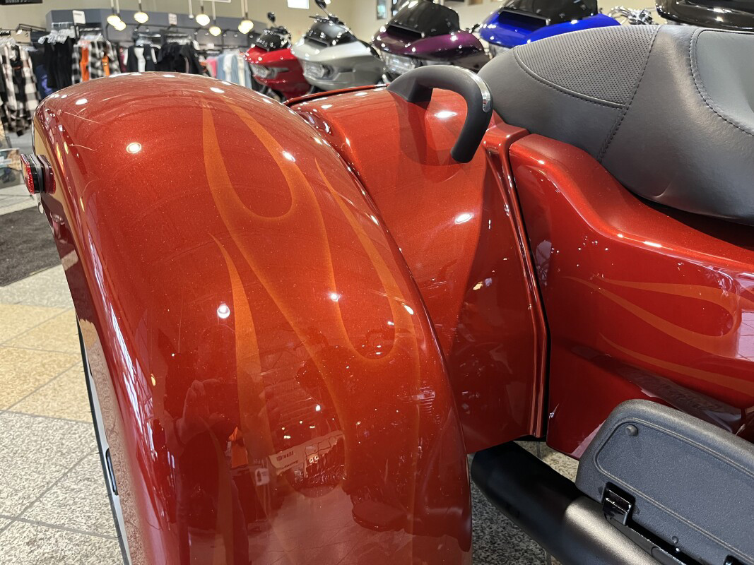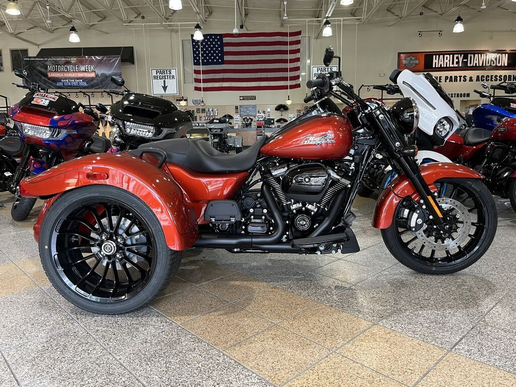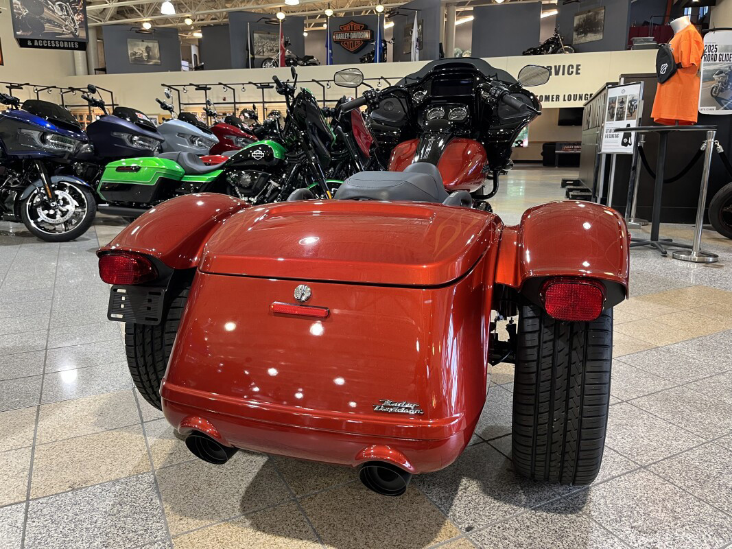 2025 Harley-Davidson Freewheeler Features may include: DESIGN Mini-Ape Handlebars Tall handlebars put the rider in a powerful and commanding stance, with iconic style and a range of adjustability for height and reach. Blacked-Out Styling Blacked-out finishes start at the front wheel and carry through the forks, dashboard, powertrain, and exhaust system. Storage Fit a pair of helmets side by side and still have extra room in the trunk that opens from right to left for easy loading, with a weatherproof, locking lid to keep all your goods safe and secure. Rear Fenders Bobtail fenders add a bit of traditional H-D flare to the Freewheeler’s rear end. Seat with Passenger Grab Handles Two-up seat features soft-touch grab handles for added passenger stability and confidence. PERFORMANCE Milwaukee-Eight 114 Engine The Milwaukee-Eight V-twin engine has plenty of power for easy highway cruising, effortless passing, and eye-watering acceleration. Front Suspension Dual-bending valve front suspension is plush and soft on the highway, but firm enough to maintain composure during hard riding. Rear Suspension Rear suspension features a quick-adjust preload knob to tune performance when adding a passenger or loading up the trunk. Slash-Down Dual Mufflers Dual mufflers with slash-down tips between the rear wheels deliver a classic hot rod style. INNOVATION Rider Safety Enhancements Keep your feet up, flip into Electric Reverse, and back into that parking spot with ease and minimal effort.