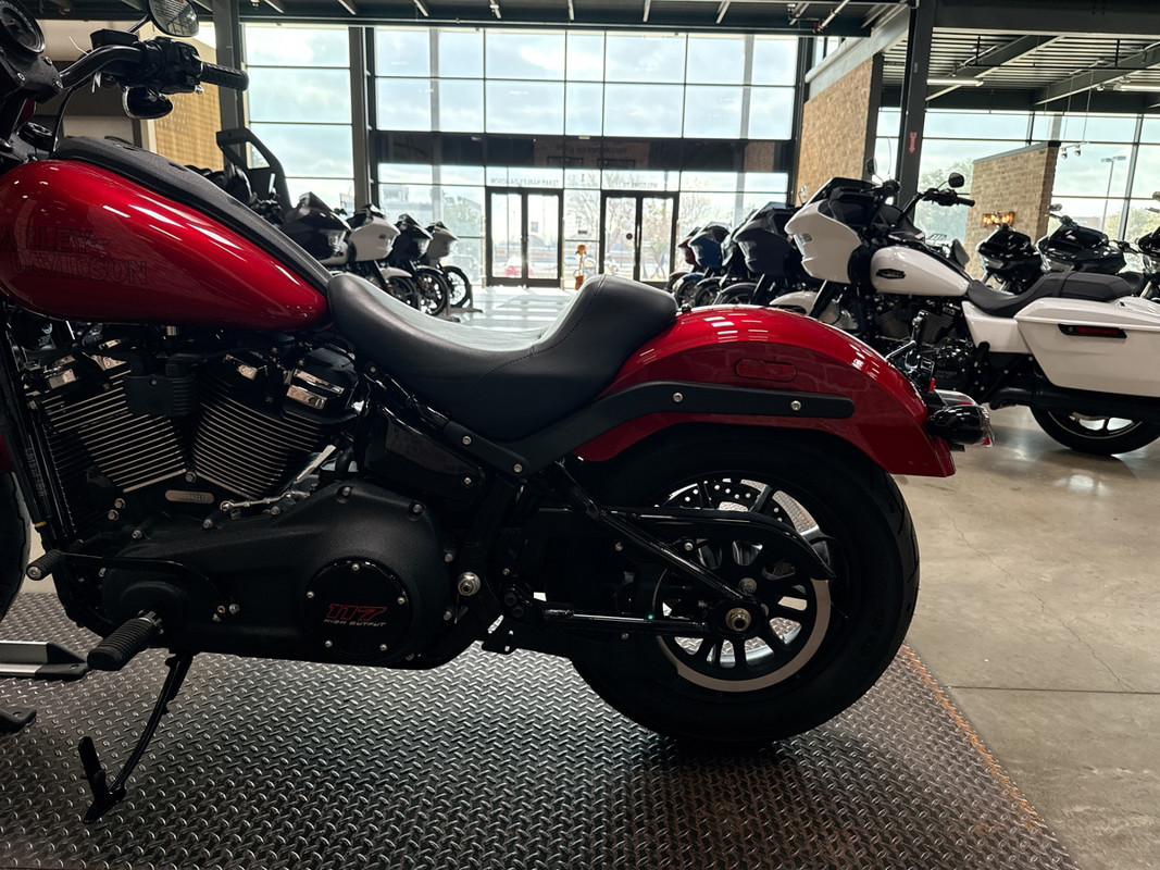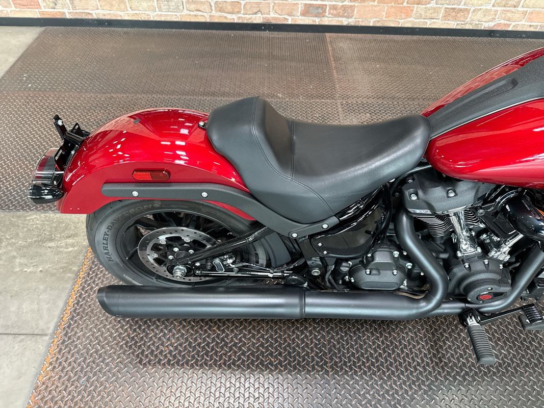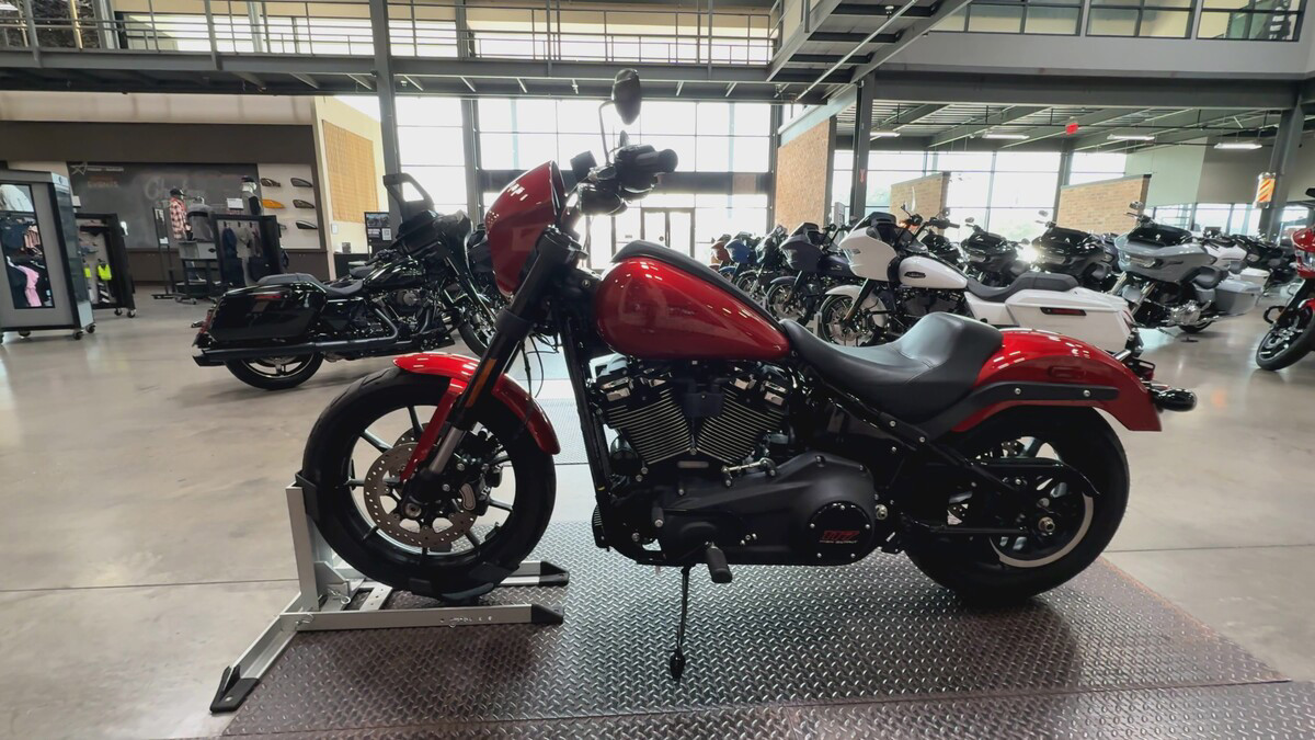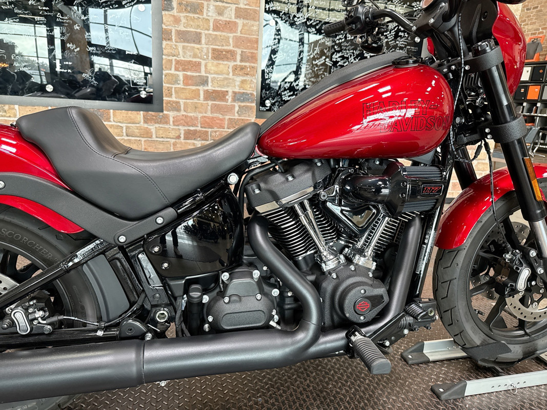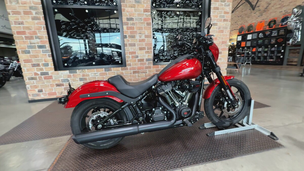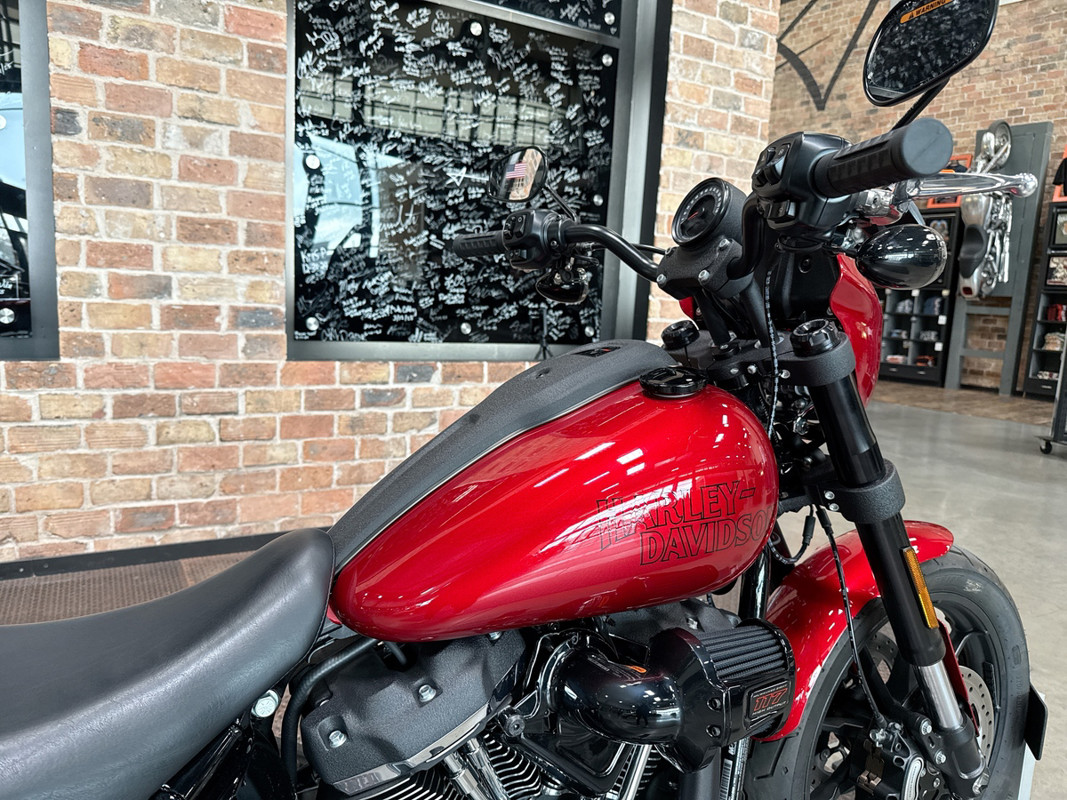The exterior of the Low Rider S is a captivating Brilliant Red, a color that demands attention and exudes confidence. This vibrant hue is perfectly complemented by sleek black accents, creating a striking contrast that enhances its bold aesthetic. The bike's design is both aggressive and elegant, making it a standout on any street.