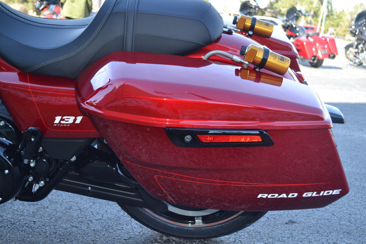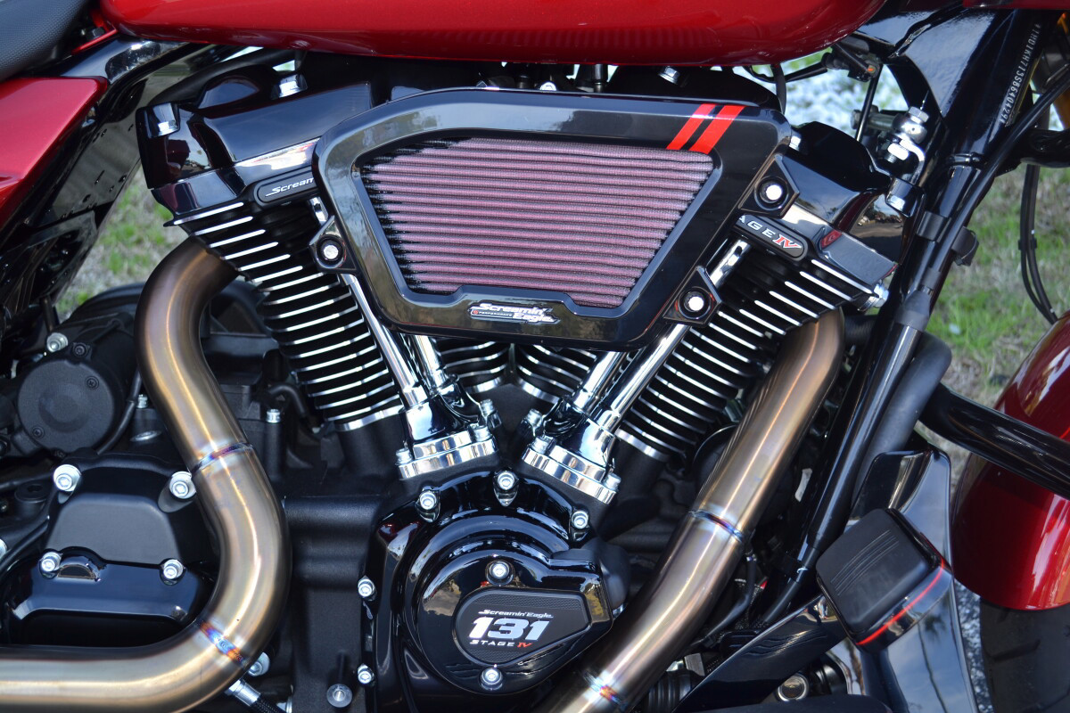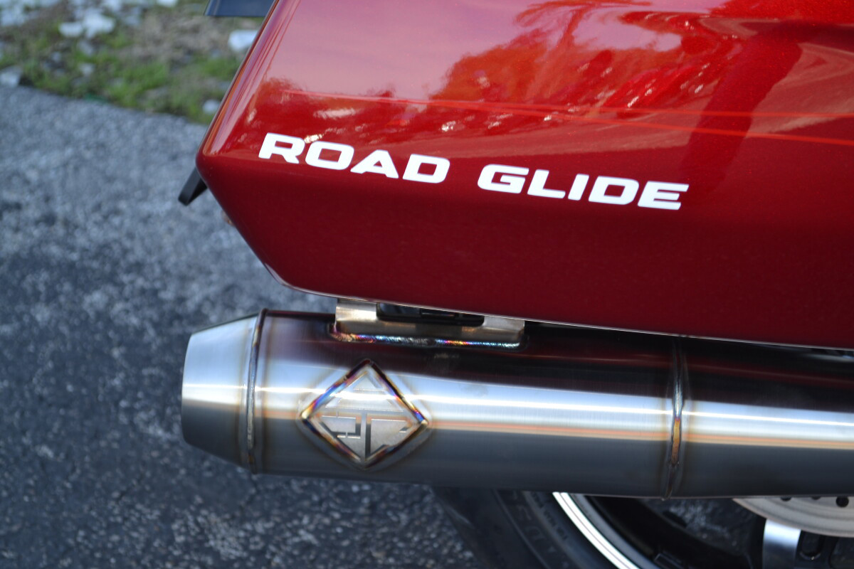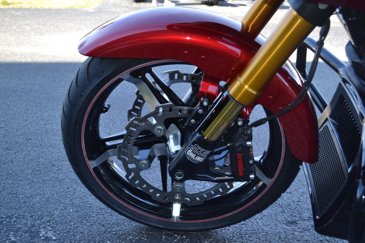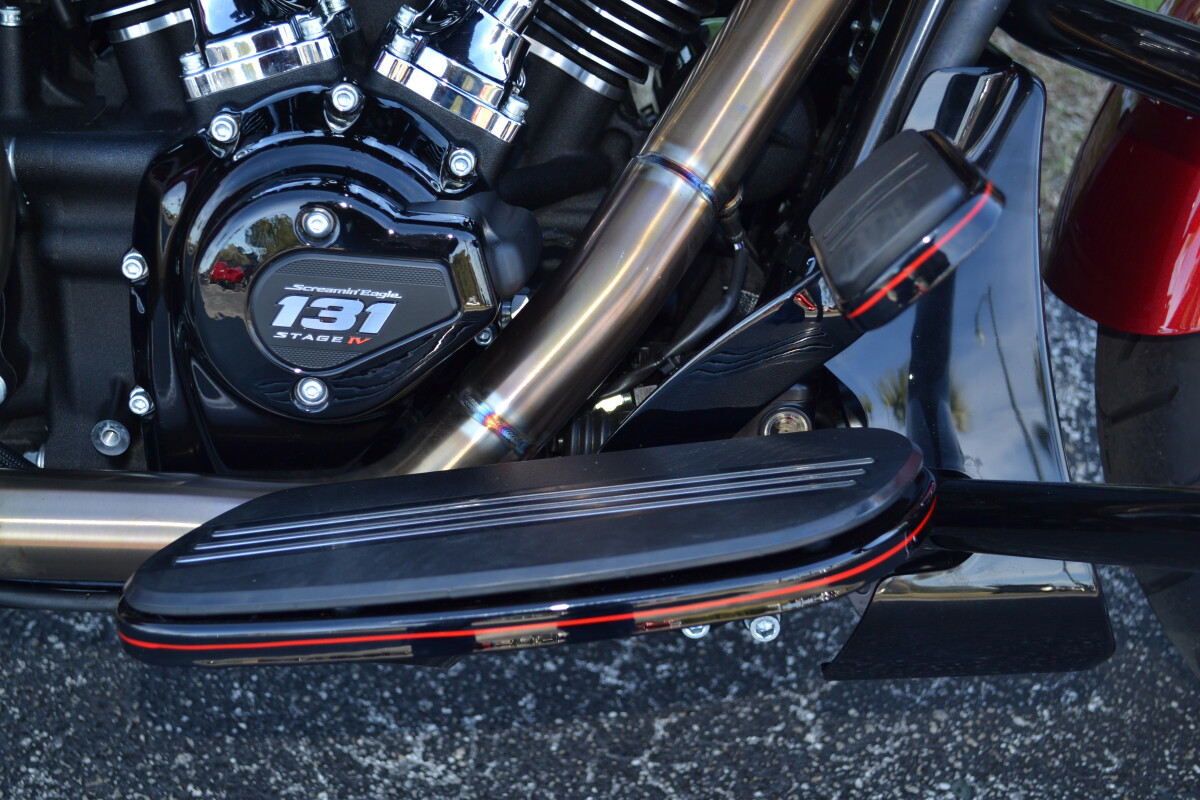 CUSTOM PINSTRIPING BY EL ROY!Screamin’ Eagle / Öhlins Inverted Gold Fork LegsScreamin' Eagle/Öhlins Remote Reservoir Gold Rear ShocksScreamin’ Eagle / Öhlins Inverted Fork Installation Kit – Road GlideScreamin’ Eagle Stage IV Kit - 117CI to 131CIScreamin' Eagle Air Cleaner - Extreme WedgeScreamin' Eagle Pro Street TunerScreamin' Eagle 131 Derby CoverSP Concepts Turnpike 2-into-1 Stainless ExhaustH-D Performance Front Brake RotorsH-D 6 Handlebar RiserH-D Touring Moto Handlebars