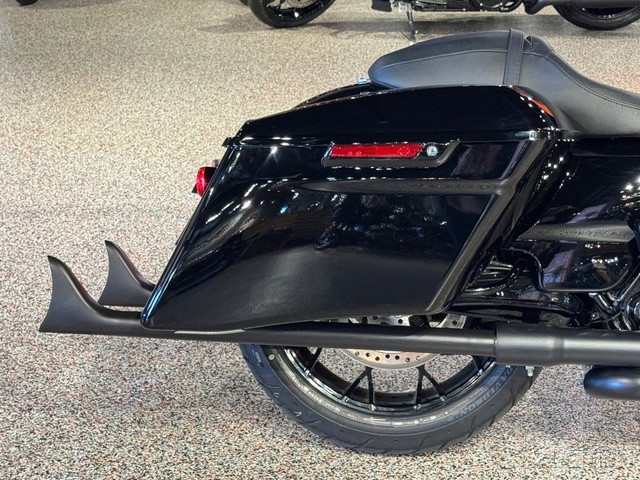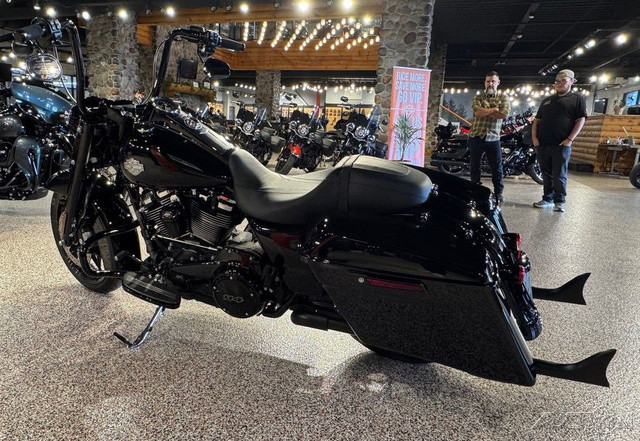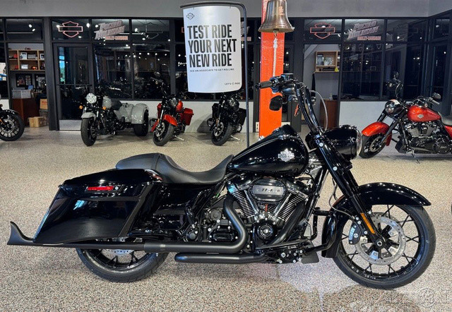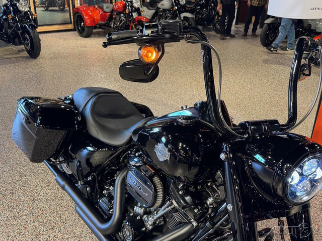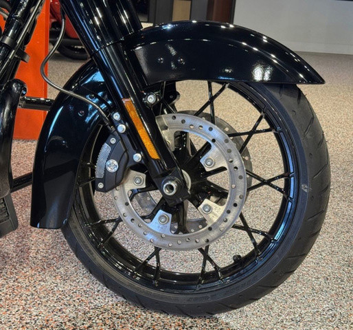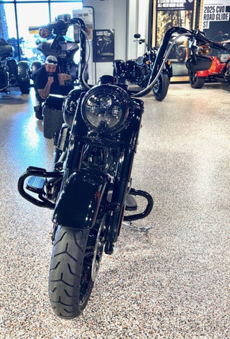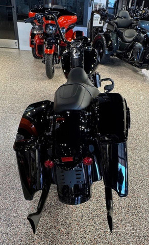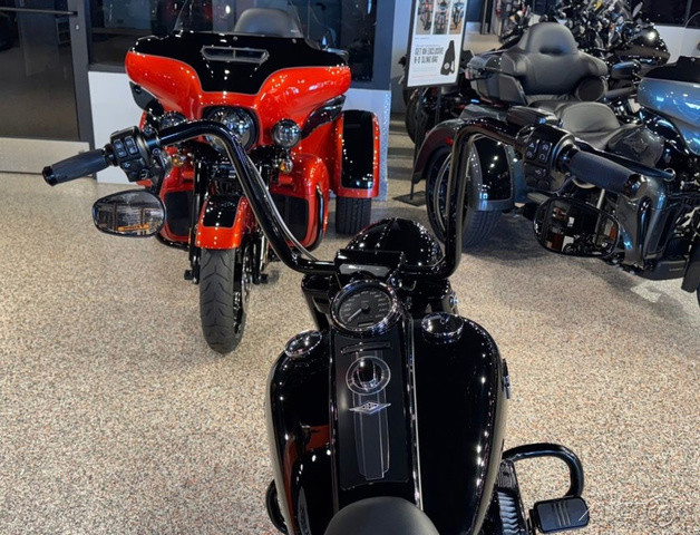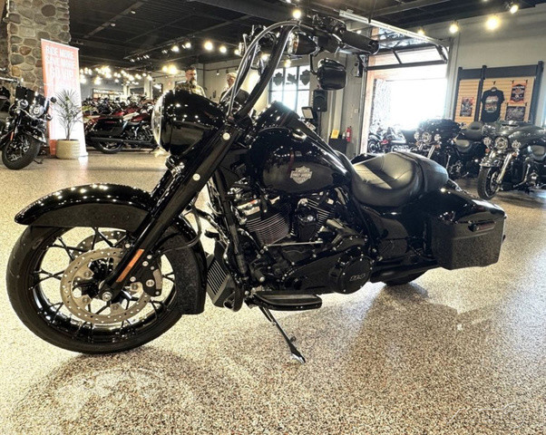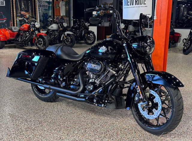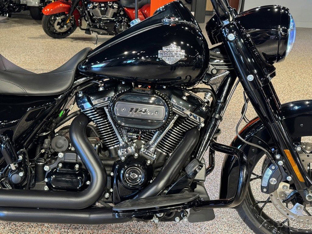 2025 Harley-Davidson® Road King® SpecialFeatures may include:DESIGNThe stripped-down bagger silhouette with stretched bags, deep black finishes, and comfortably commanding ergonomics.Blacked-Out StylingBlacked-out powertrain is built with a mixture of gloss and matte finishes to provide depth and texture.SaddlebagsStretched saddlebags provide added storage and a smooth line that flows with the blacked-out exhaust system.Mini-Ape HandlebarsMini-Apes put the rider in an upright, commanding stance with a range of adjustability to personalize height and reach.PERFORMANCEMilwaukee-Eight® power optimized with a high-performance air cleaner and a high-flowing, two-into two exhaust, backed by high-performance Brembo brakes and SHOWA® suspension.Milwaukee-Eight® 114 V-Twin EngineAs versatile as it is powerful, the Milwaukee-Eight® 114 V-twin engine is tuned to deliver peak torque in the low revs for rapid acceleration and churn out plenty of horsepower for effortless highway cruising.Brembo BrakesIncredible stopping power with direct feel at the lever and pedal, thanks to top-shelf braking components developed with Brembo.High-Performance Air CleanerHigh-performance ribbed air cleaner with an exposed filter allows more air to pass through, improving engine response and performance.INNOVATIONSet your speed and relax with easily managed Cruise Control as a standard feature.