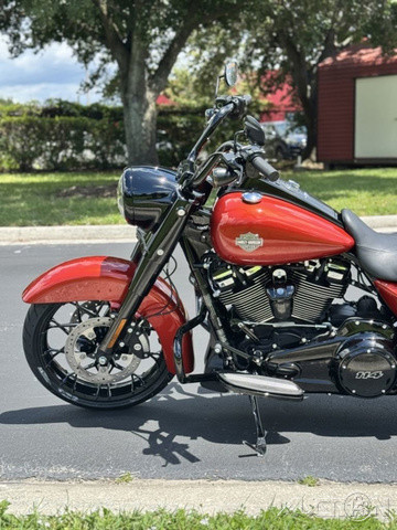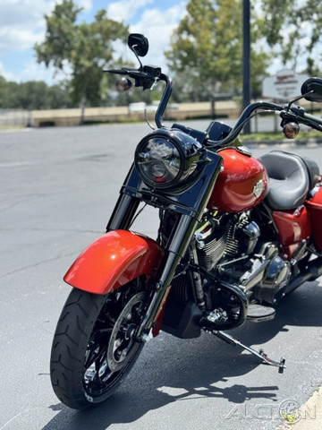 2025 Harley-Davidson® Road King® SpecialFeatures may include:DESIGNThe stripped-down bagger silhouette with stretched bags, deep black finishes, and comfortably commanding ergonomics.Blacked-Out StylingBlacked-out powertrain is built with a mixture of gloss and matte finishes to provide depth and texture.SaddlebagsStretched saddlebags provide added storage and a smooth line that flows with the blacked-out exhaust system.Mini-Ape HandlebarsMini-Apes put the rider in an upright, commanding stance with a range of adjustability to personalize height and reach.PERFORMANCEMilwaukee-Eight® power optimized with a high-performance air cleaner and a high-flowing, two-into two exhaust, backed by high-performance Brembo brakes and SHOWA® suspension.Milwaukee-Eight® 114 V-Twin EngineAs versatile as it is powerful, the Milwaukee-Eight® 114 V-twin engine is tuned to deliver peak torque in the low revs for rapid acceleration and churn out plenty of horsepower for effortless highway cruising.Brembo BrakesIncredible stopping power with direct feel at the lever and pedal, thanks to top-shelf braking components developed with Brembo.High-Performance Air CleanerHigh-performance ribbed air cleaner with an exposed filter allows more air to pass through, improving engine response and performance.INNOVATIONSet your speed and relax with easily managed Cruise Control as a standard feature.