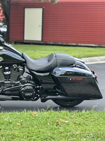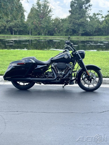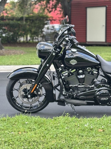 2025 Harley-Davidson® Road King® SpecialFeatures may include:DESIGNThe stripped-down bagger silhouette with stretched bags, deep black finishes, and comfortably commanding ergonomics.Blacked-Out StylingBlacked-out powertrain is built with a mixture of gloss and matte finishes to provide depth and texture.SaddlebagsStretched saddlebags provide added storage and a smooth line that flows with the blacked-out exhaust system.Mini-Ape HandlebarsMini-Apes put the rider in an upright, commanding stance with a range of adjustability to personalize height and reach.PERFORMANCEMilwaukee-Eight® power optimized with a high-performance air cleaner and a high-flowing, two-into two exhaust, backed by high-performance Brembo brakes and SHOWA® suspension.Milwaukee-Eight® 114 V-Twin EngineAs versatile as it is powerful, the Milwaukee-Eight® 114 V-twin engine is tuned to deliver peak torque in the low revs for rapid acceleration and churn out plenty of horsepower for effortless highway cruising.Brembo BrakesIncredible stopping power with direct feel at the lever and pedal, thanks to top-shelf braking components developed with Brembo.High-Performance Air CleanerHigh-performance ribbed air cleaner with an exposed filter allows more air to pass through, improving engine response and performance.INNOVATIONSet your speed and relax with easily managed Cruise Control as a standard feature.