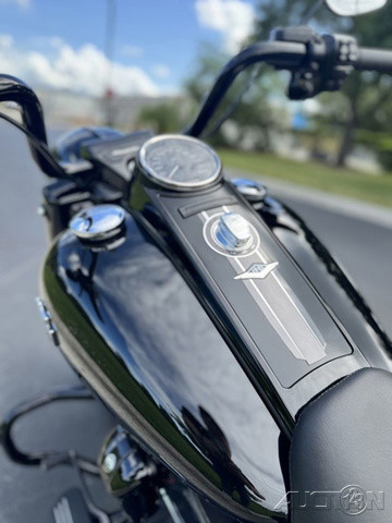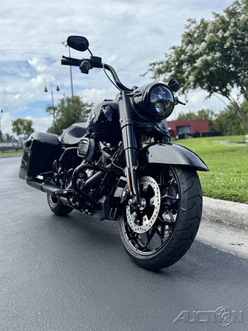 2025 Harley-Davidson® Road King® SpecialFeatures may include:DESIGNThe stripped-down bagger silhouette with stretched bags, deep black finishes, and comfortably commanding ergonomics.Blacked-Out StylingBlacked-out powertrain is built with a mixture of gloss and matte finishes to provide depth and texture.SaddlebagsStretched saddlebags provide added storage and a smooth line that flows with the blacked-out exhaust system.Mini-Ape HandlebarsMini-Apes put the rider in an upright, commanding stance with a range of adjustability to personalize height and reach.PERFORMANCEMilwaukee-Eight® power optimized with a high-performance air cleaner and a high-flowing, two-into two exhaust, backed by high-performance Brembo brakes and SHOWA® suspension.Milwaukee-Eight® 114 V-Twin EngineAs versatile as it is powerful, the Milwaukee-Eight® 114 V-twin engine is tuned to deliver peak torque in the low revs for rapid acceleration and churn out plenty of horsepower for effortless highway cruising.Brembo BrakesIncredible stopping power with direct feel at the lever and pedal, thanks to top-shelf braking components developed with Brembo.High-Performance Air CleanerHigh-performance ribbed air cleaner with an exposed filter allows more air to pass through, improving engine response and performance.INNOVATIONSet your speed and relax with easily managed Cruise Control as a standard feature.