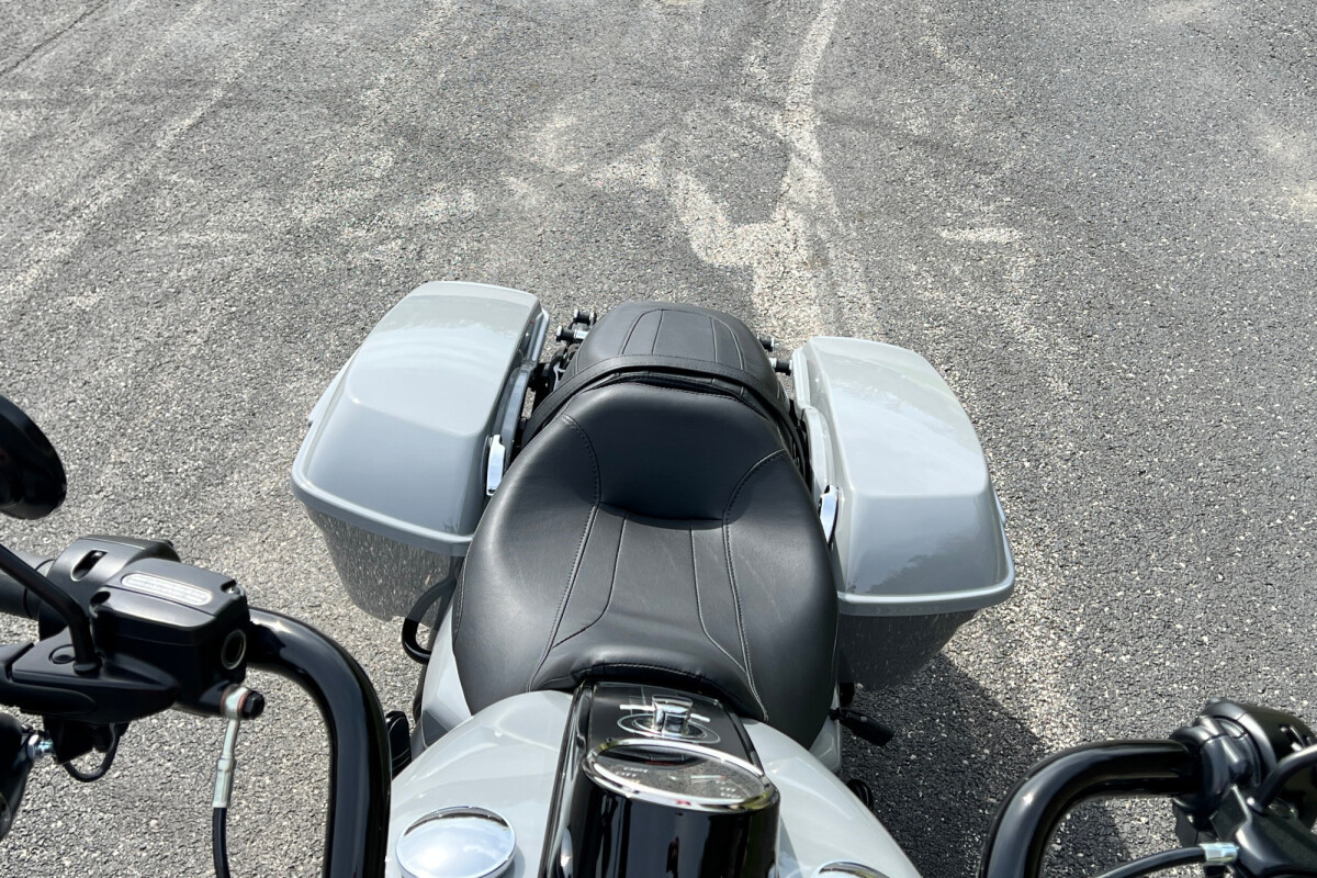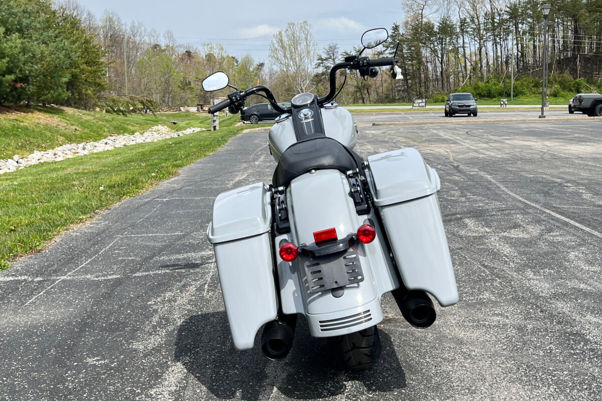 Stretched saddlebags provide added storage and a smooth line that flows with the blacked-out exhaust system.