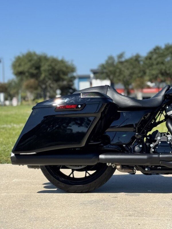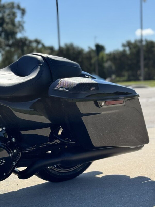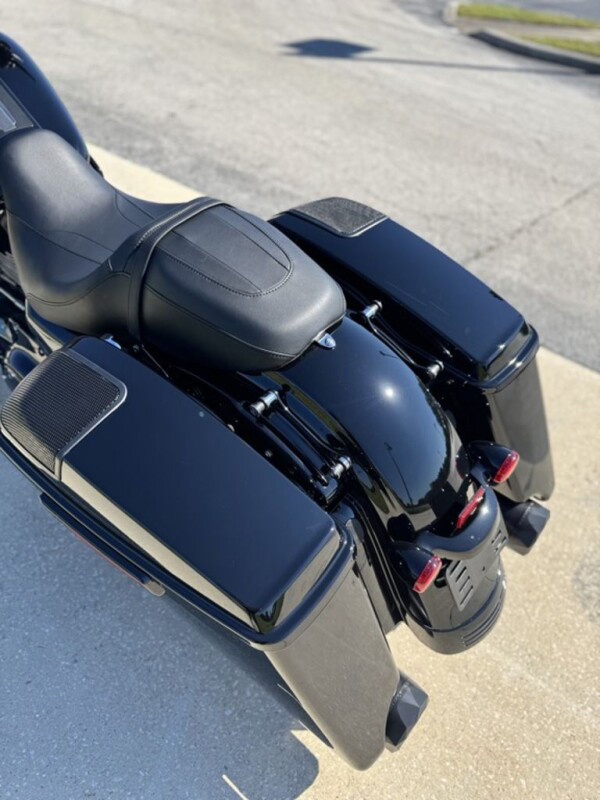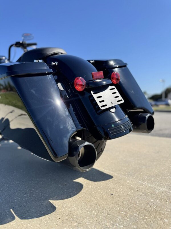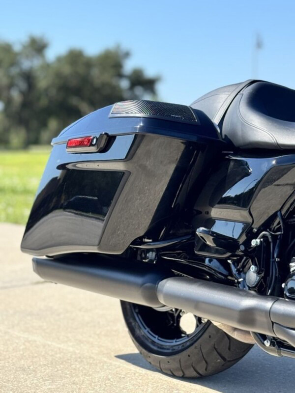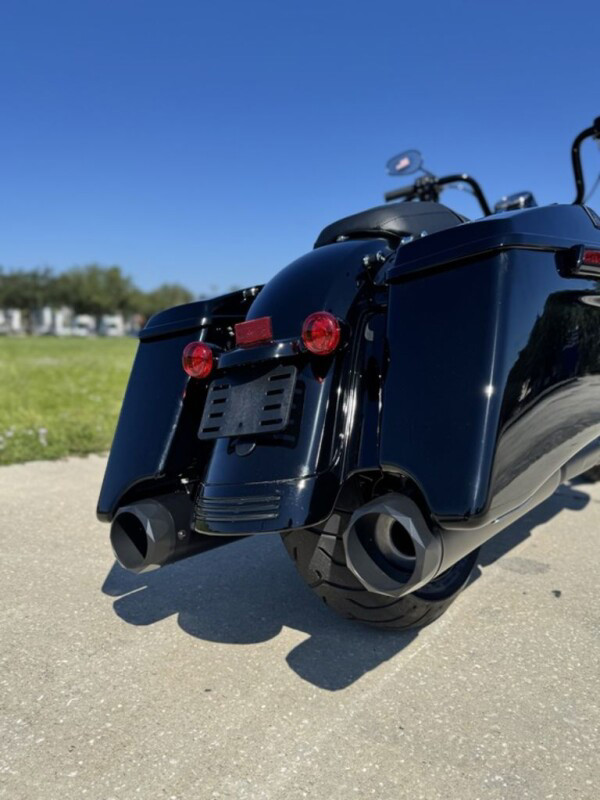 Stretched saddlebags provide added storage and a smooth line that flows with the blacked-out exhaust system.