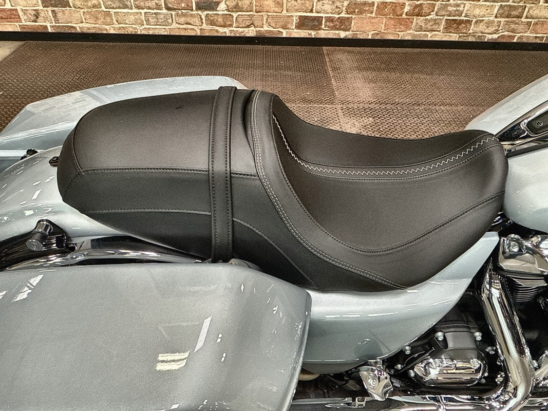 The exterior of the Street Glide Touring is finished in a stunning Atlas Silver Metallic, a color that not only exudes elegance but also enhances the bike's sleek and aerodynamic profile. The chrome accents add a touch of sophistication, ensuring that this motorcycle turns heads wherever it goes. With only 7 miles on the odometer, this bike is as fresh as they come, ready to embark on countless journeys.