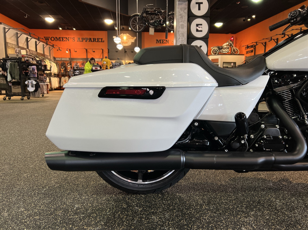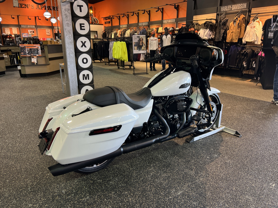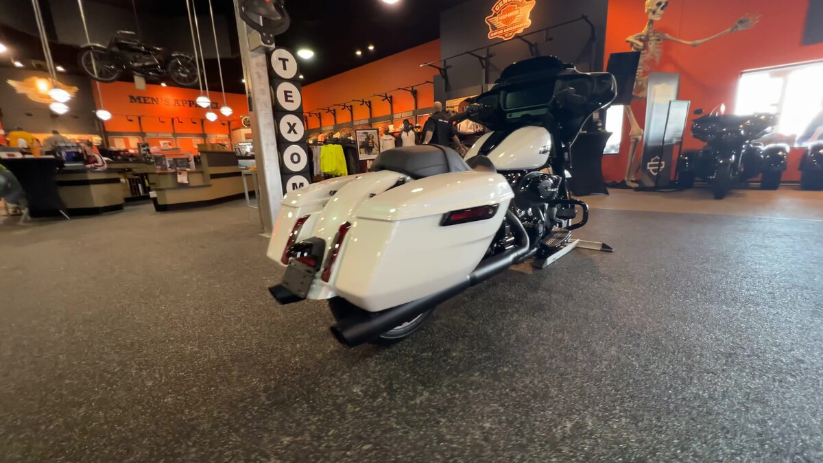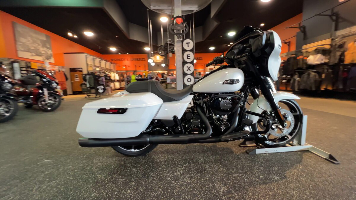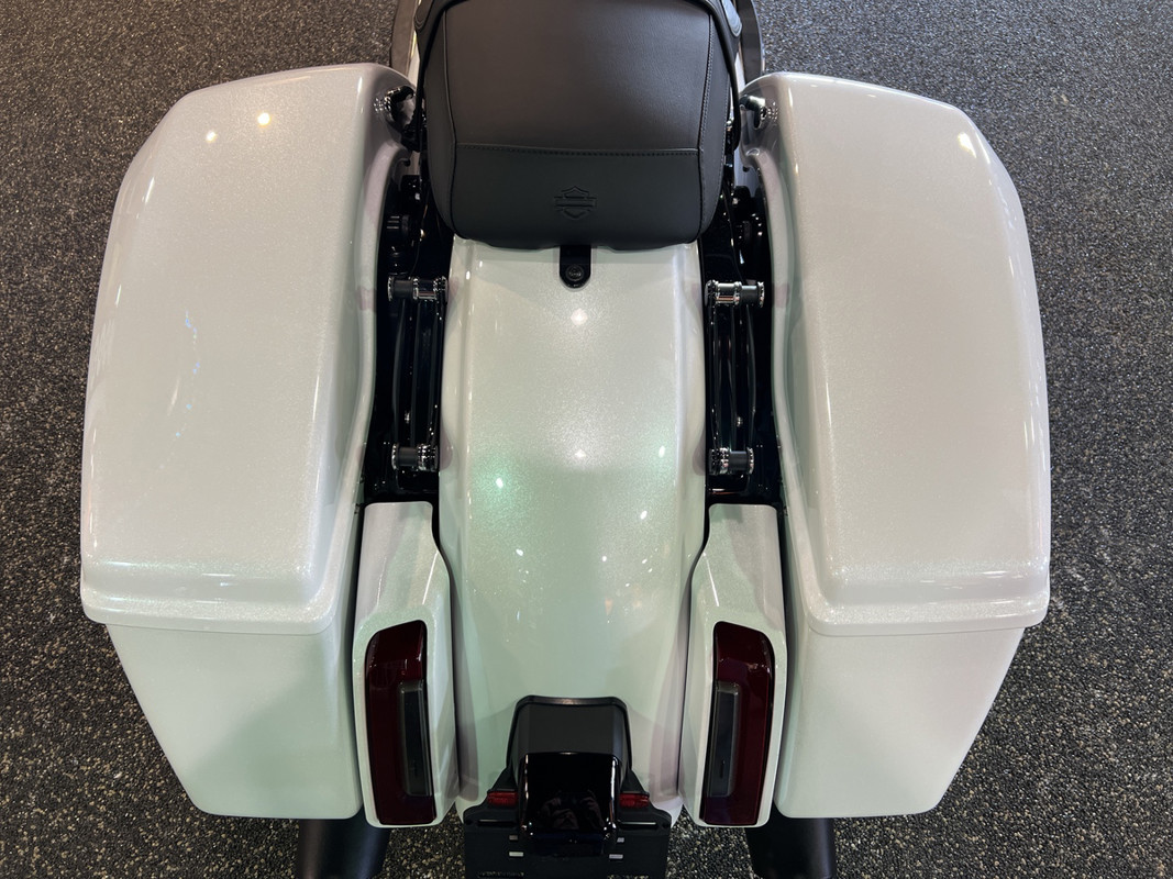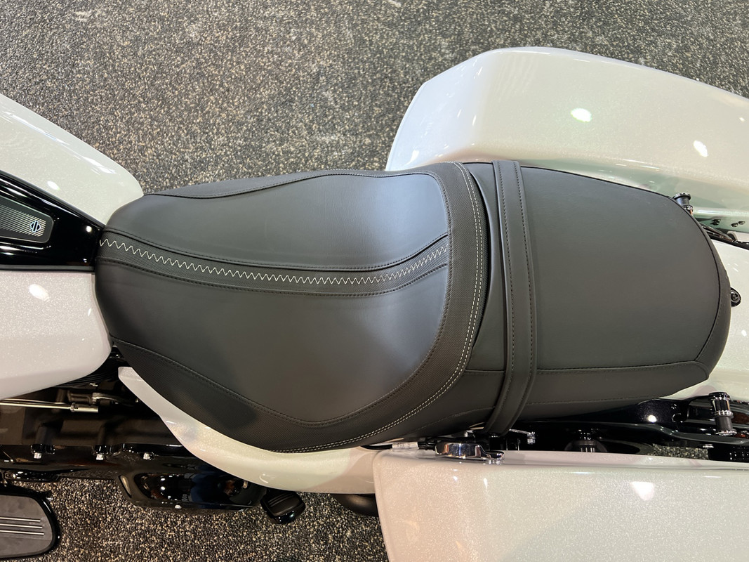 The exterior of the Street Glide Touring is finished in a stunning White Onyx Pearl, a color that exudes elegance and sophistication. This pristine shade is complemented by the sleek lines and robust build of the motorcycle, making it a head-turner on the road. The bike's design is both aerodynamic and stylish, ensuring it not only looks good but also performs exceptionally well.