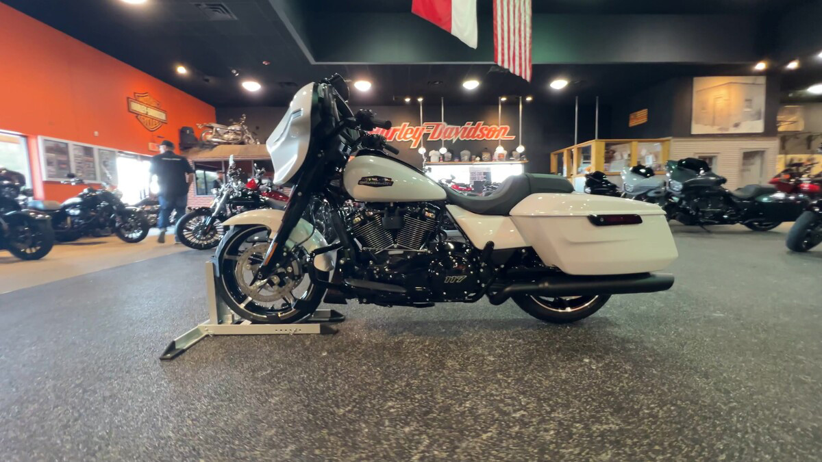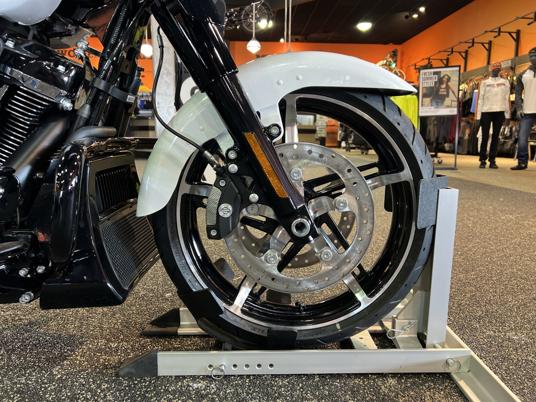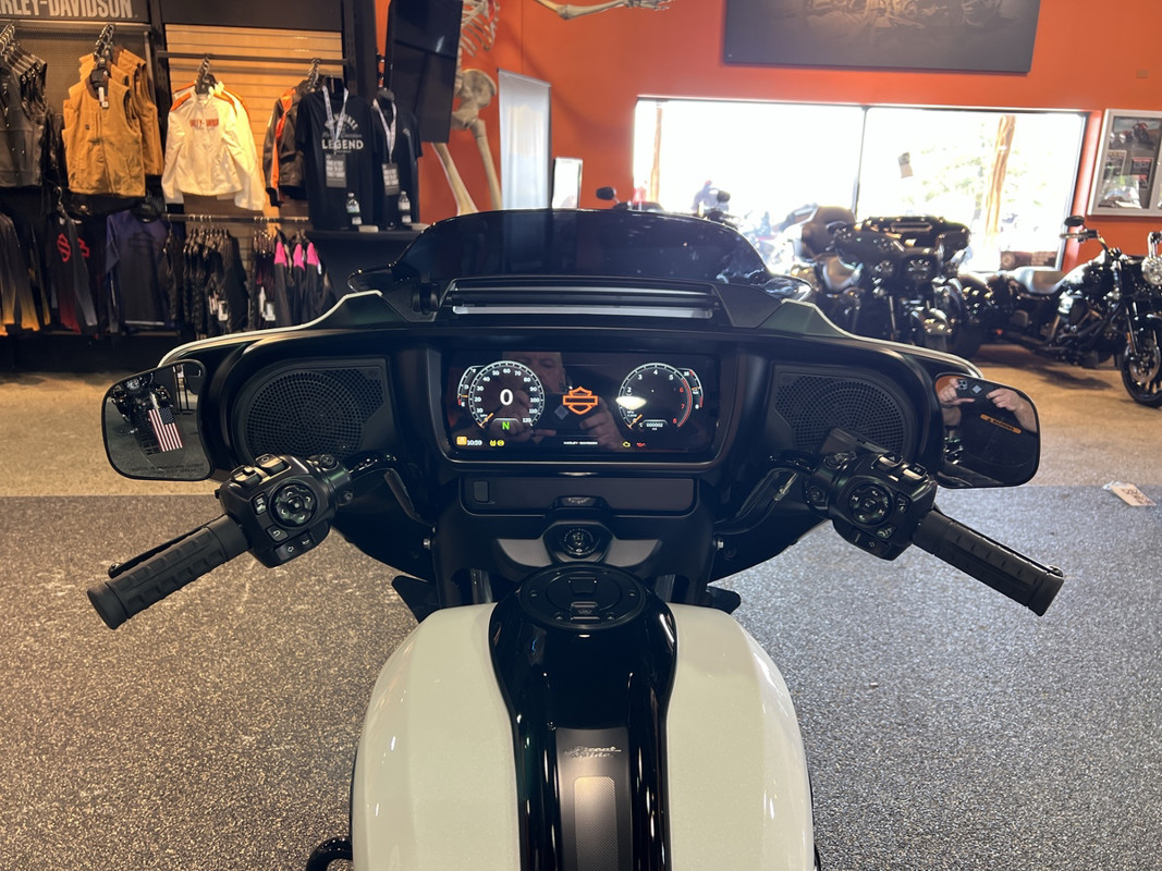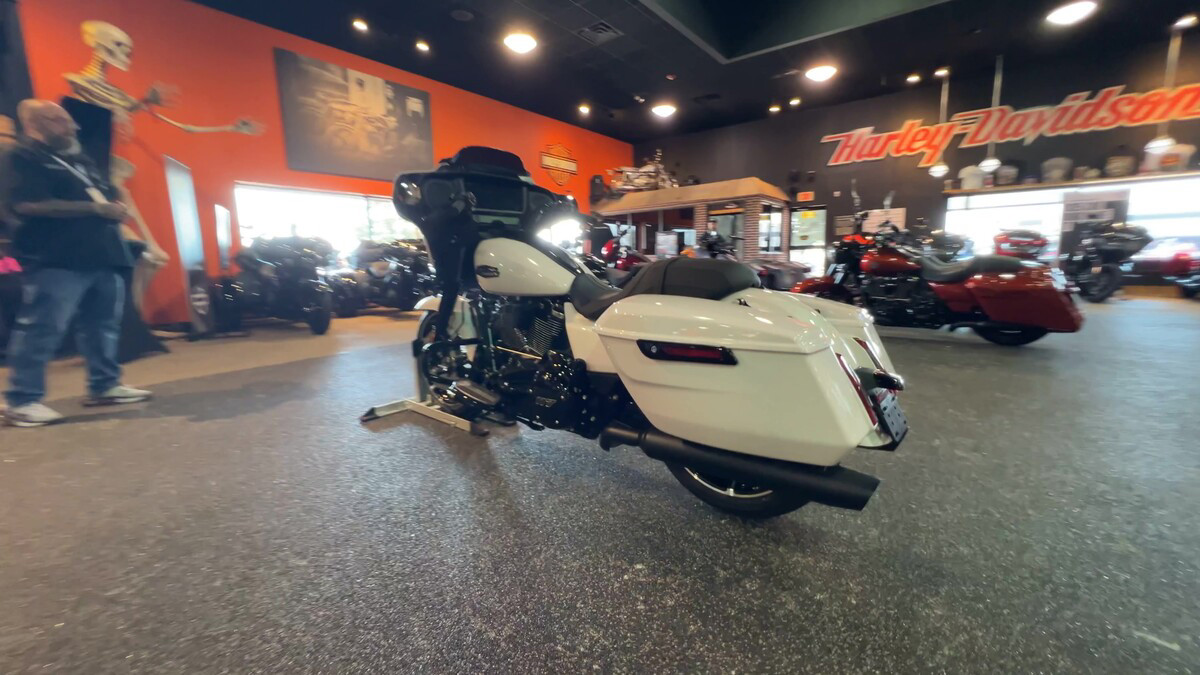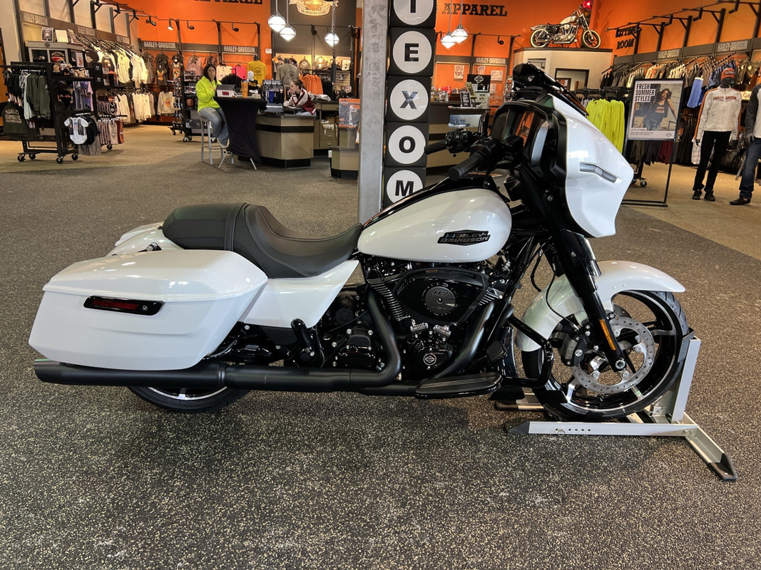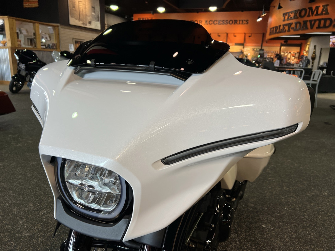 The exterior of the Street Glide Touring is finished in a stunning White Onyx Pearl, a color that exudes elegance and sophistication. This pristine shade is complemented by the sleek lines and robust build of the motorcycle, making it a head-turner on the road. The bike's design is both aerodynamic and stylish, ensuring it not only looks good but also performs exceptionally well.