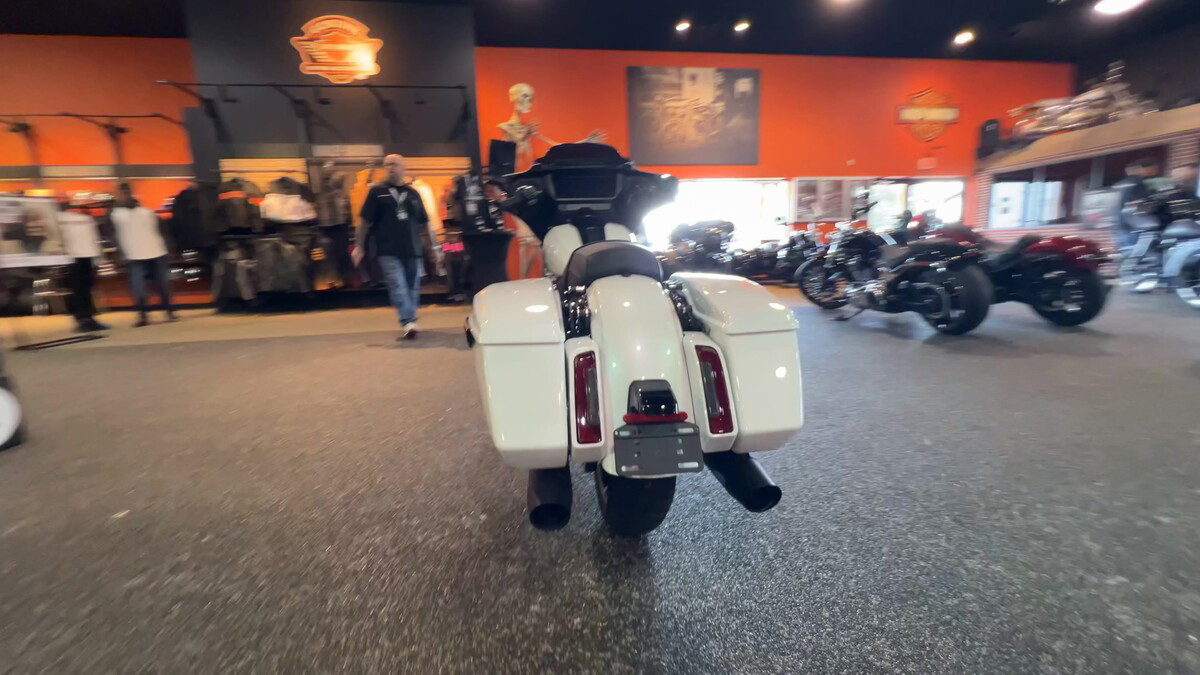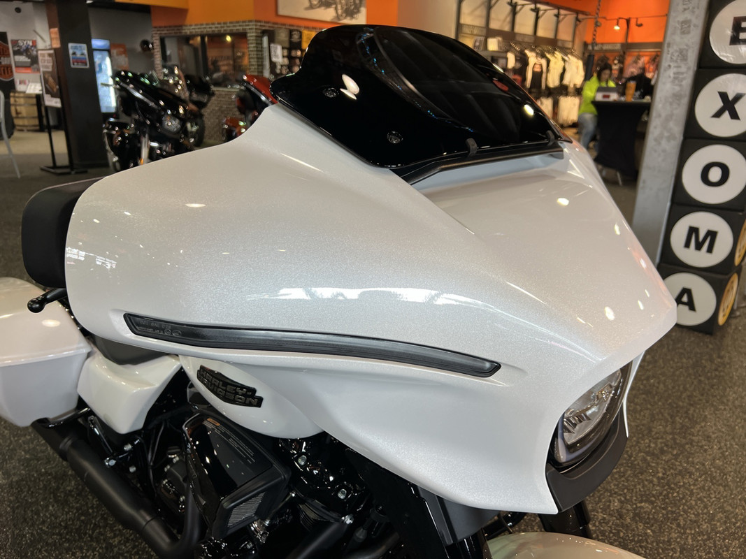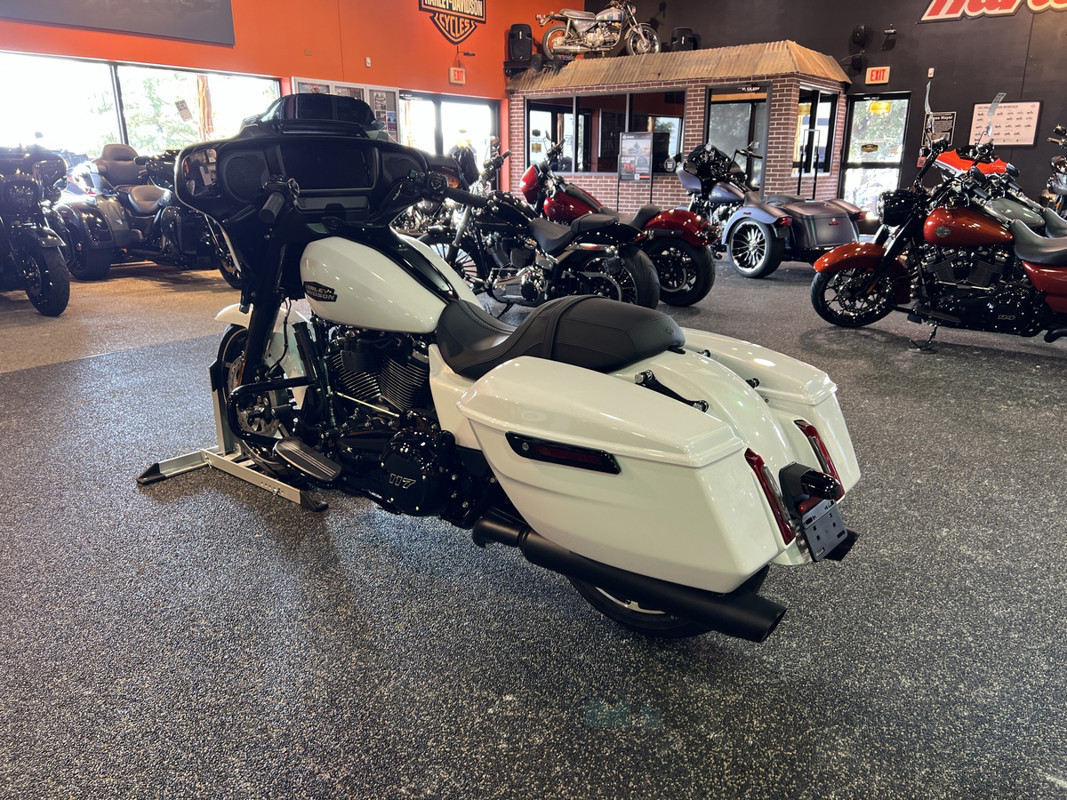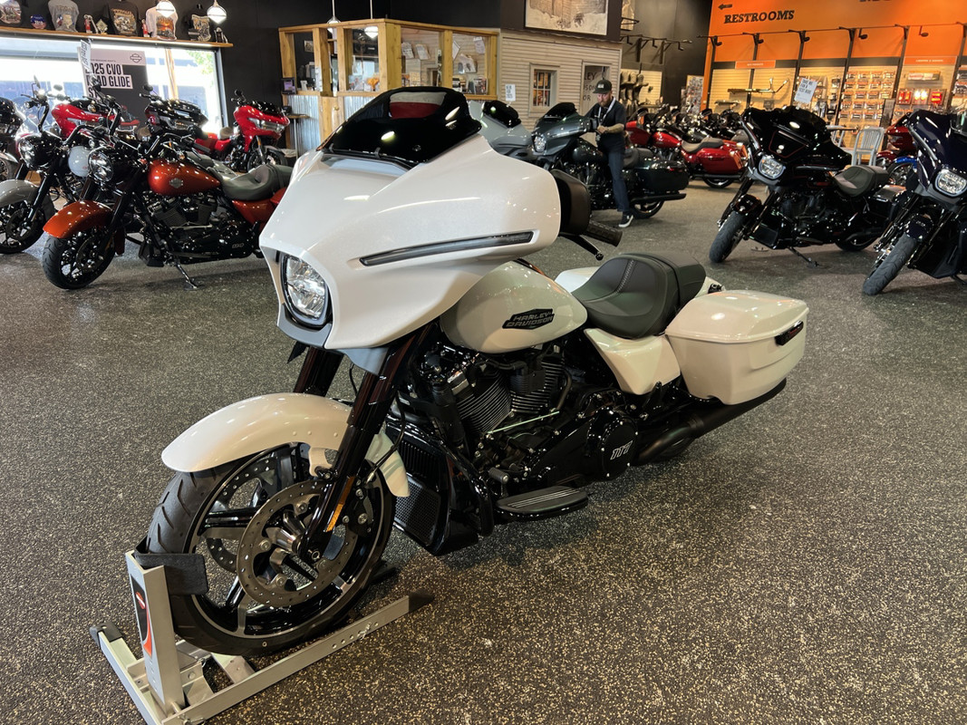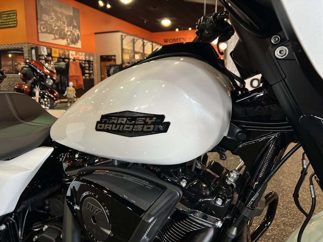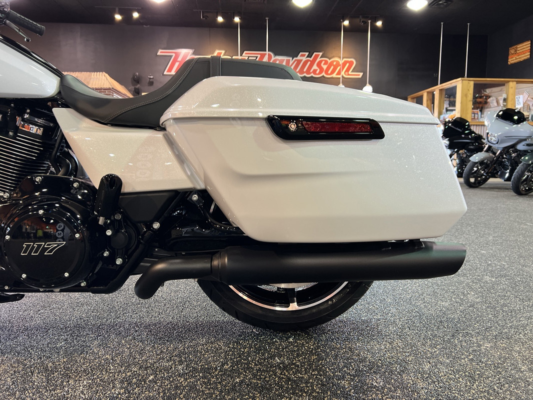 The exterior of the Street Glide Touring is finished in a stunning White Onyx Pearl, a color that exudes elegance and sophistication. This pristine shade is complemented by the sleek lines and robust build of the motorcycle, making it a head-turner on the road. The bike's design is both aerodynamic and stylish, ensuring it not only looks good but also performs exceptionally well.
