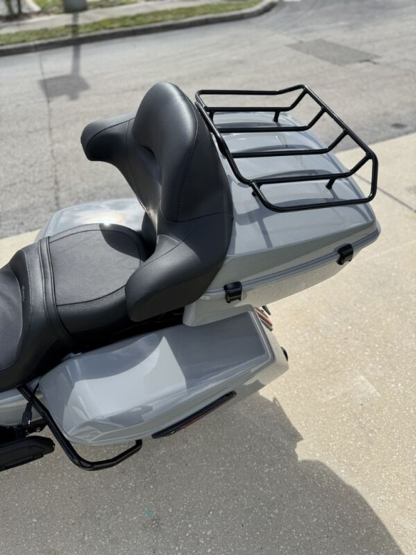 King Tour-Pak luggage carrier comes standard and has a robust passenger back pad with armrests. The hard-shell luggage carrier, fairing cubbies, and large saddlebags offer 4.9 cubic feet of combined storage—more than twice that on a standard Street Glide.