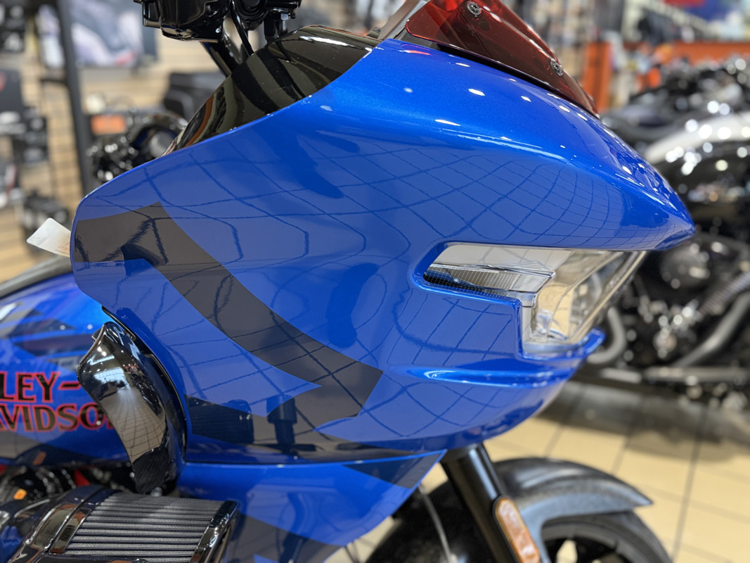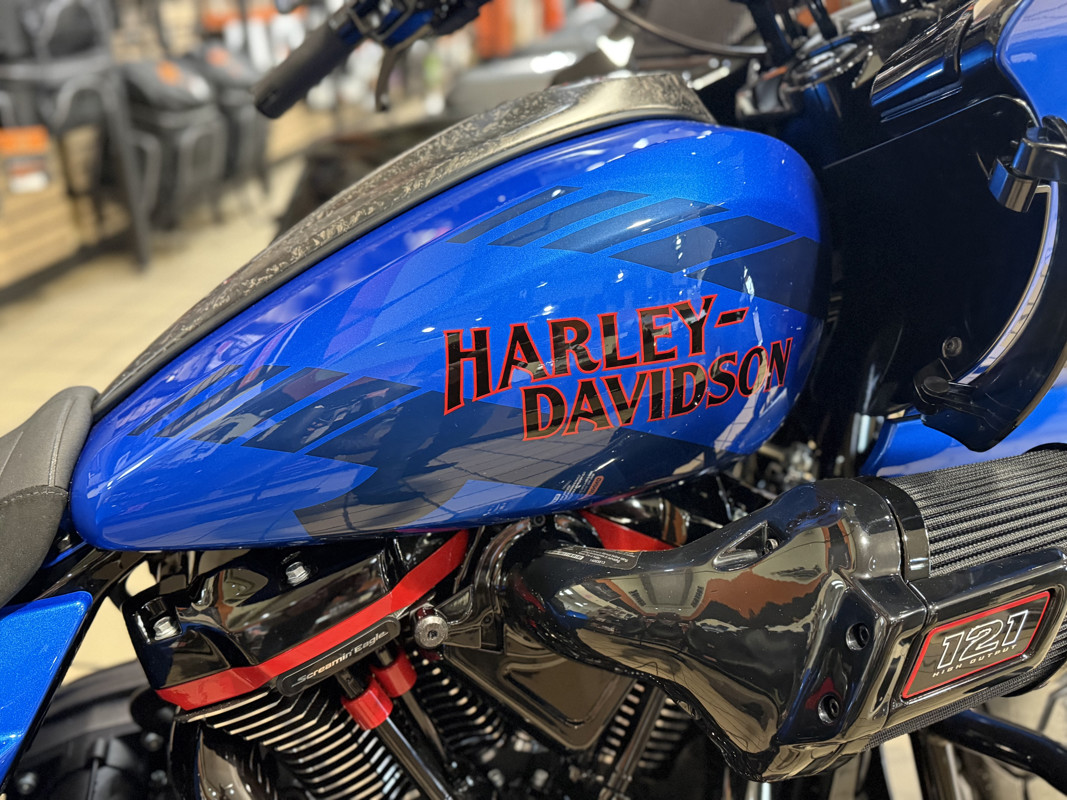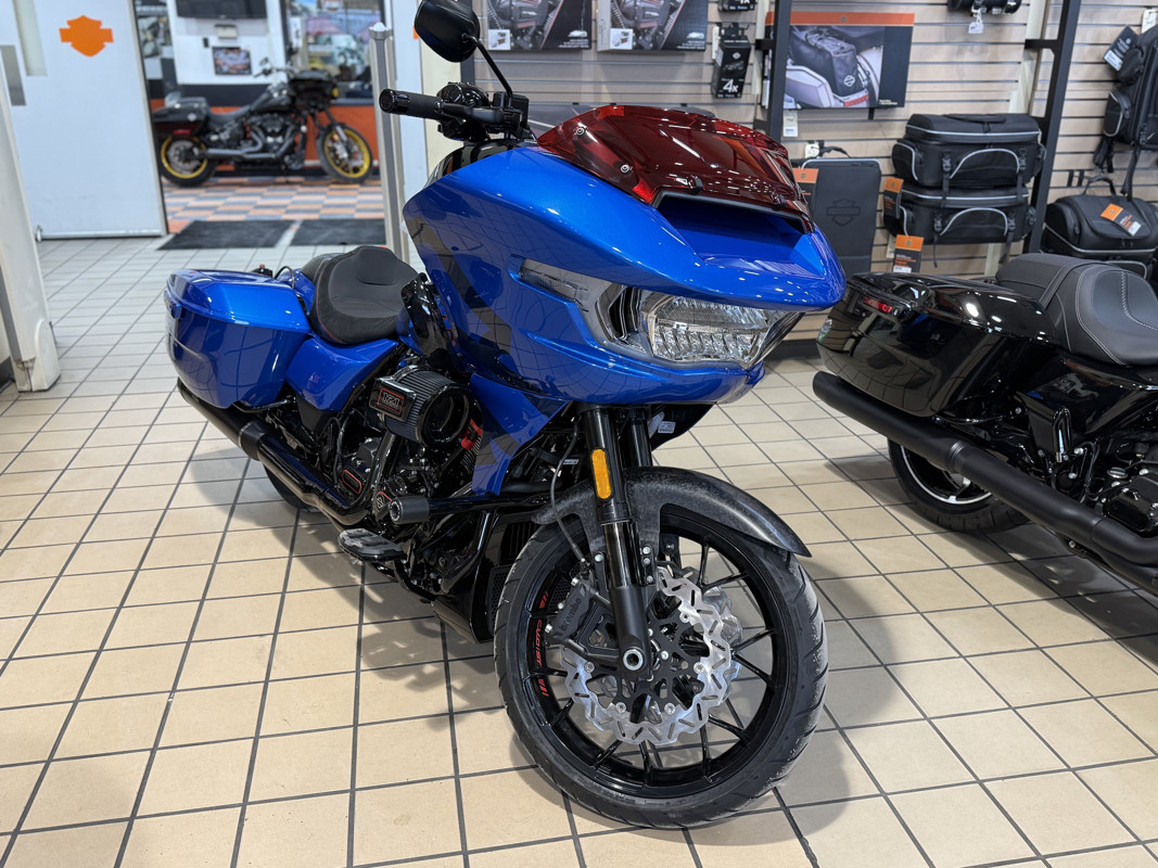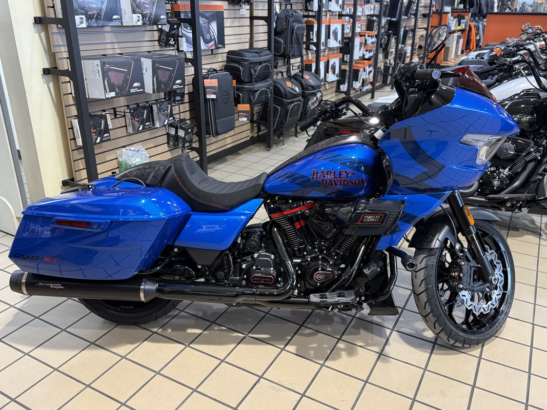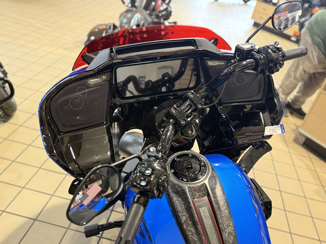 The 2026 CVO Road Glide ST is Harley-Davidson’s race-inspired bagger at its most ruthless. Its Milwaukee-Eight® 121 High Output motor delivers unbelievable power and performance, fed by a Heavy Breather intake and finished with titanium-capped mufflers. Forged carbon fiber details, tall risers with a factory moto-bar setup, remote-reservoir suspension, and specialized track modes give it the look and feel of a purpose-built weapon engineered to outpace everything around you.