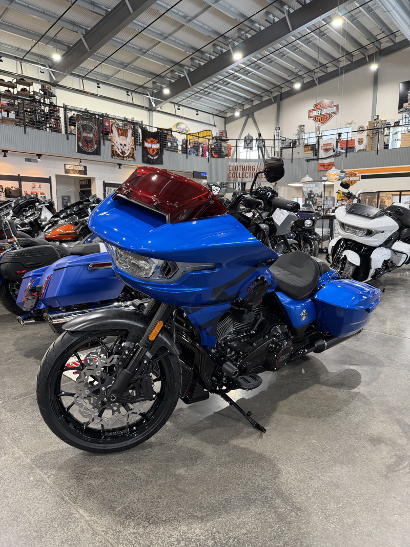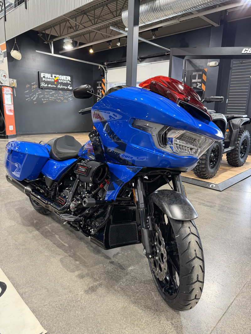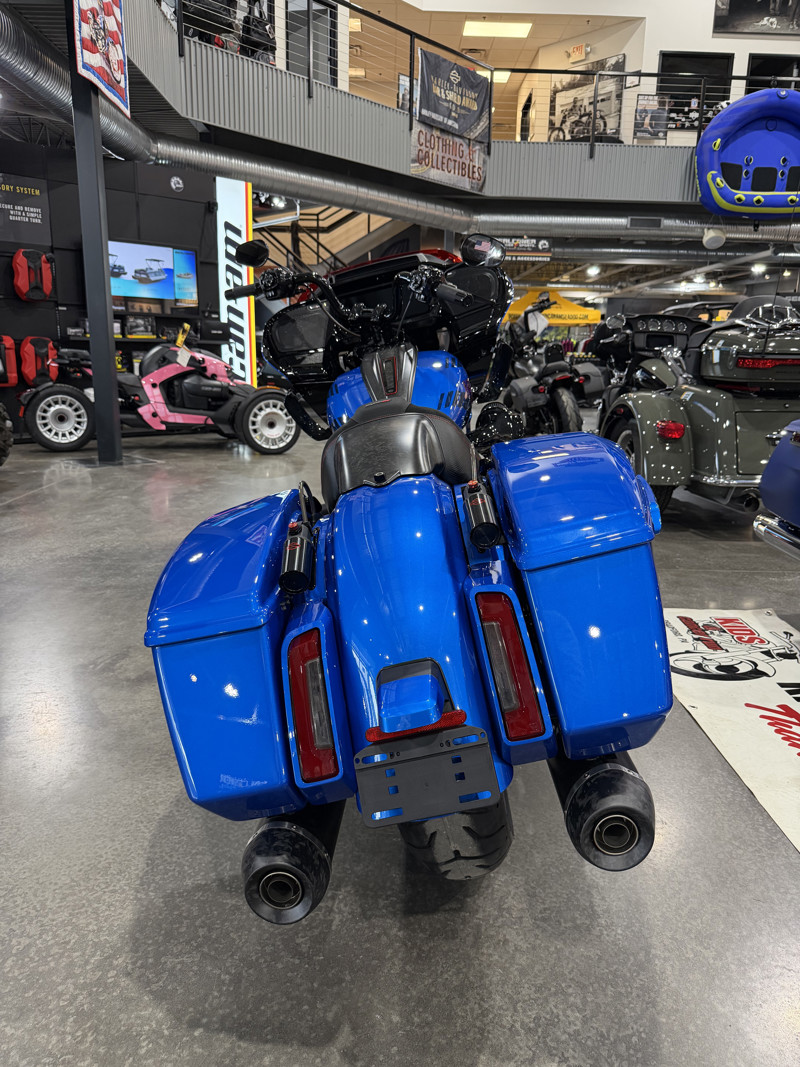 The 2026 CVO Road Glide ST is Harley-Davidson’s race-inspired bagger at its most ruthless. Its Milwaukee-Eight® 121 High Output motor delivers unbelievable power and performance, fed by a Heavy Breather intake and finished with titanium-capped mufflers. Forged carbon fiber details, tall risers with a factory moto-bar setup, remote-reservoir suspension, and specialized track modes give it the look and feel of a purpose-built weapon engineered to outpace everything around you.